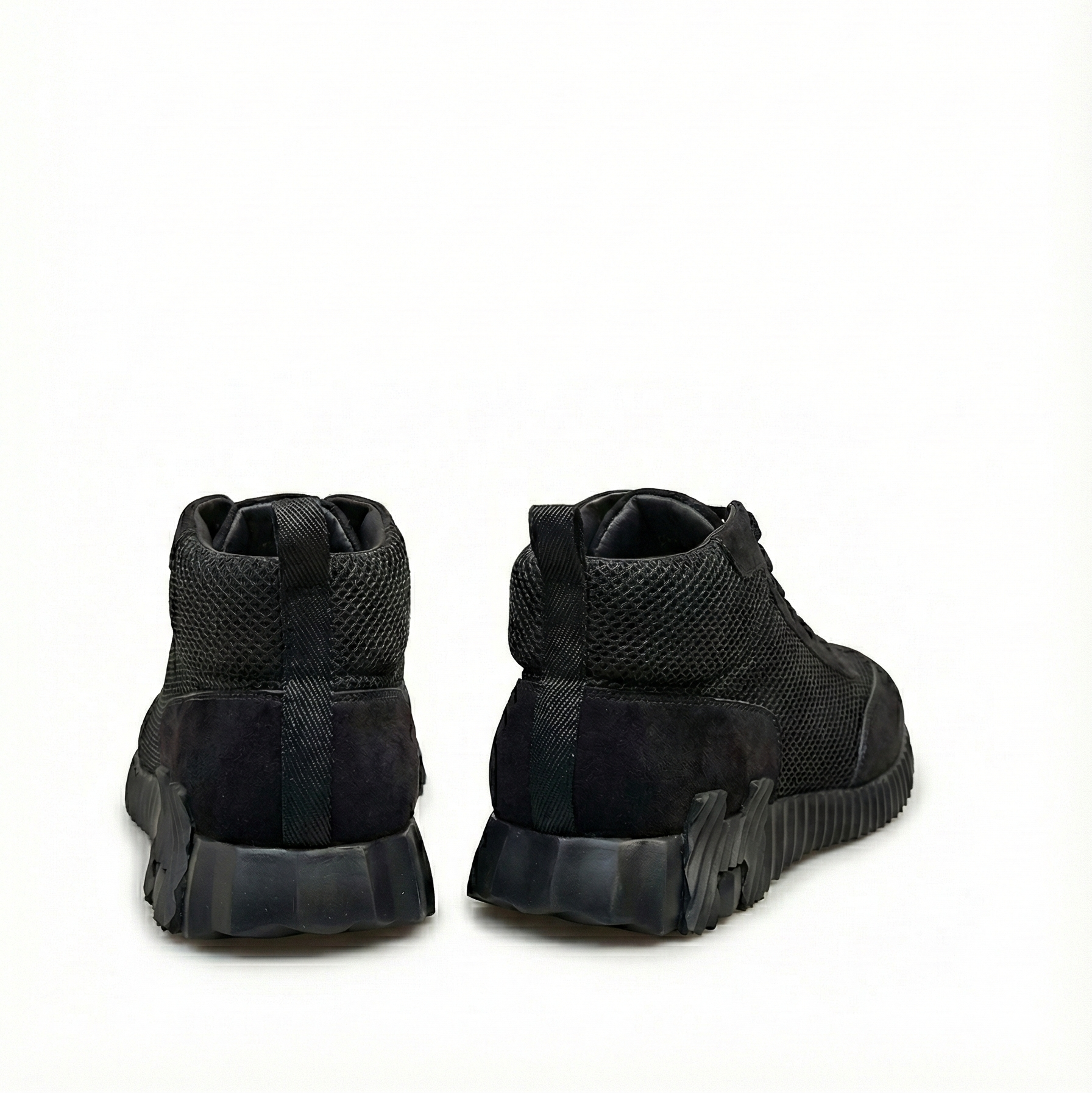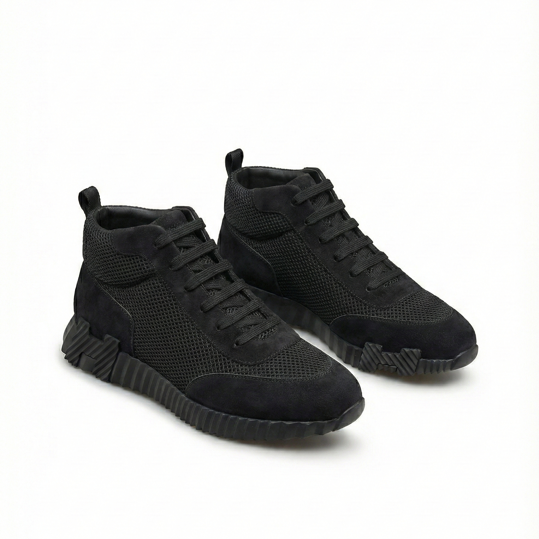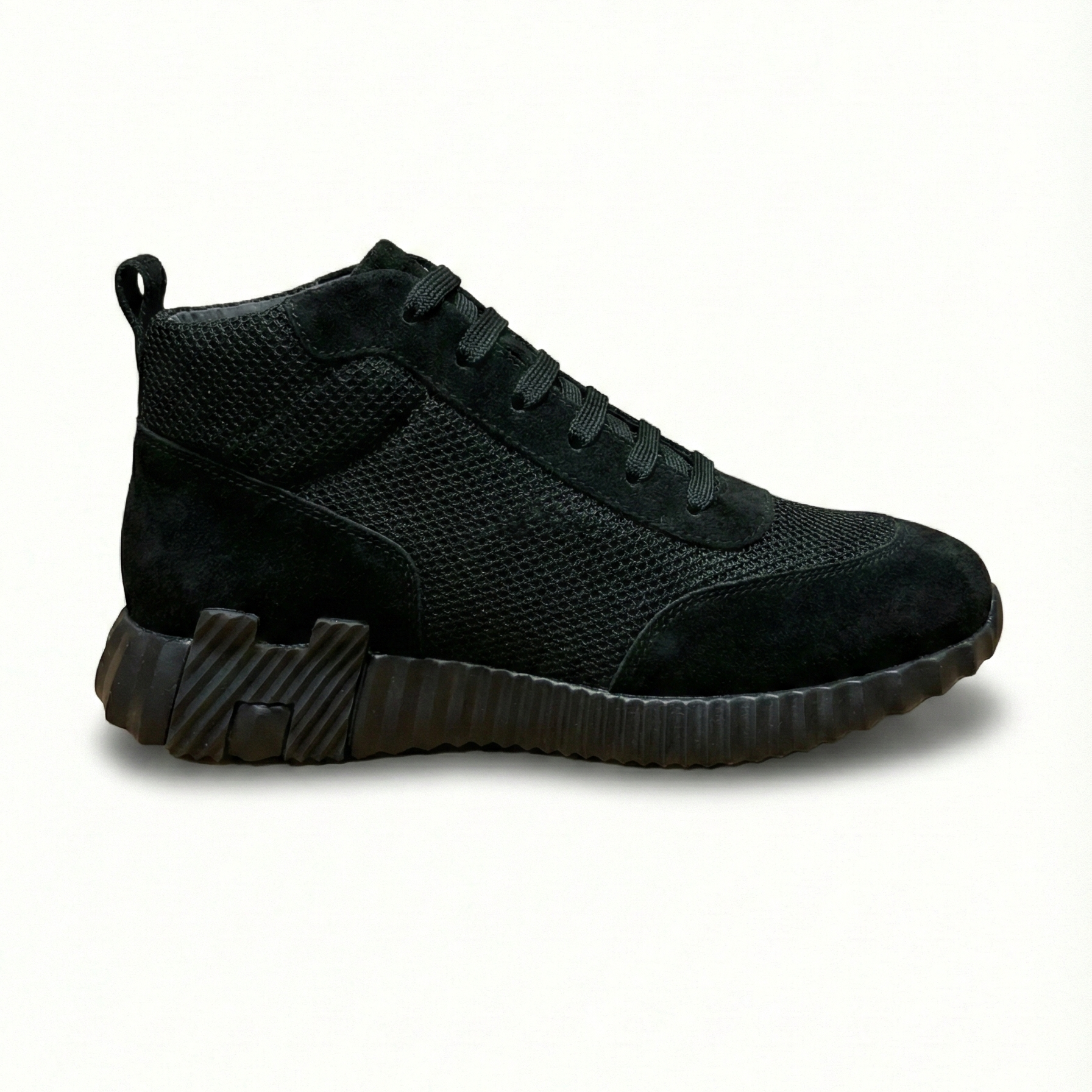 The Bouncing High-Top Sneakers in black present a monochrome interpretation of Hermès’ contemporary sneaker design. Crafted from supple suede calfskin and finely structured technical mesh, the upper combines softness with breathability, creating a refined contrast of textures within a streamlined silhouette. The deep black tone enhances the graphic purity of the design while underscoring its understated elegance.
