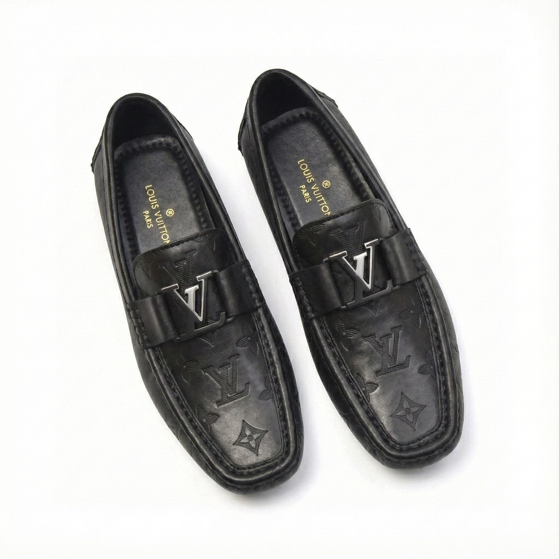 These Louis Vuitton Driver Moccasins deliver timeless luxury with everyday comfort. Crafted from premium black leather embossed with the iconic LV Monogram, they feature a hand-stitched moccasin construction and a sleek LV metal buckle across the vamp. Designed for flexibility and elegance, the soft leather upper pairs with a driver-style rubber sole for smooth grip and effortless wear. Perfect for refined casual outfits or polished smart-casual looks.