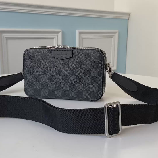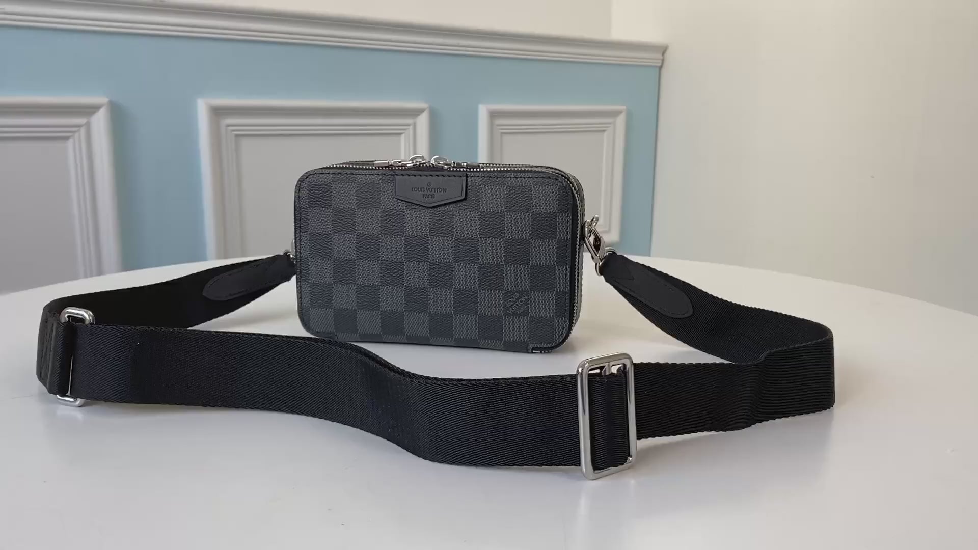 The bag features dual zip compartments for organized storage, premium silver-tone hardware engraved with the LV signature, and a durable adjustable textile strap for comfortable all-day wear. Sleek leather trim and precise stitching highlight Louis Vuitton’s renowned craftsmanship. Inside, multiple pockets keep your essentials—phones, wallet, keys—secure and easily accessible.