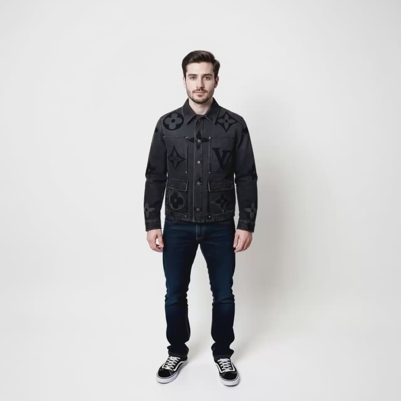 A bold reinterpretation of classic denim, this jacket blends utilitarian structure with Maison artistry. Crafted in a faded black wash, the piece is elevated by a Diagonal Epi jacquard motif and overprinted Monogram Macro gradient effect that shifts seamlessly from dark to light. Iconic Monogram flower studs enrich the chest pockets, while a nubuck leather patch with Damier embossing and metallic LV logo finishes the back in signature style.