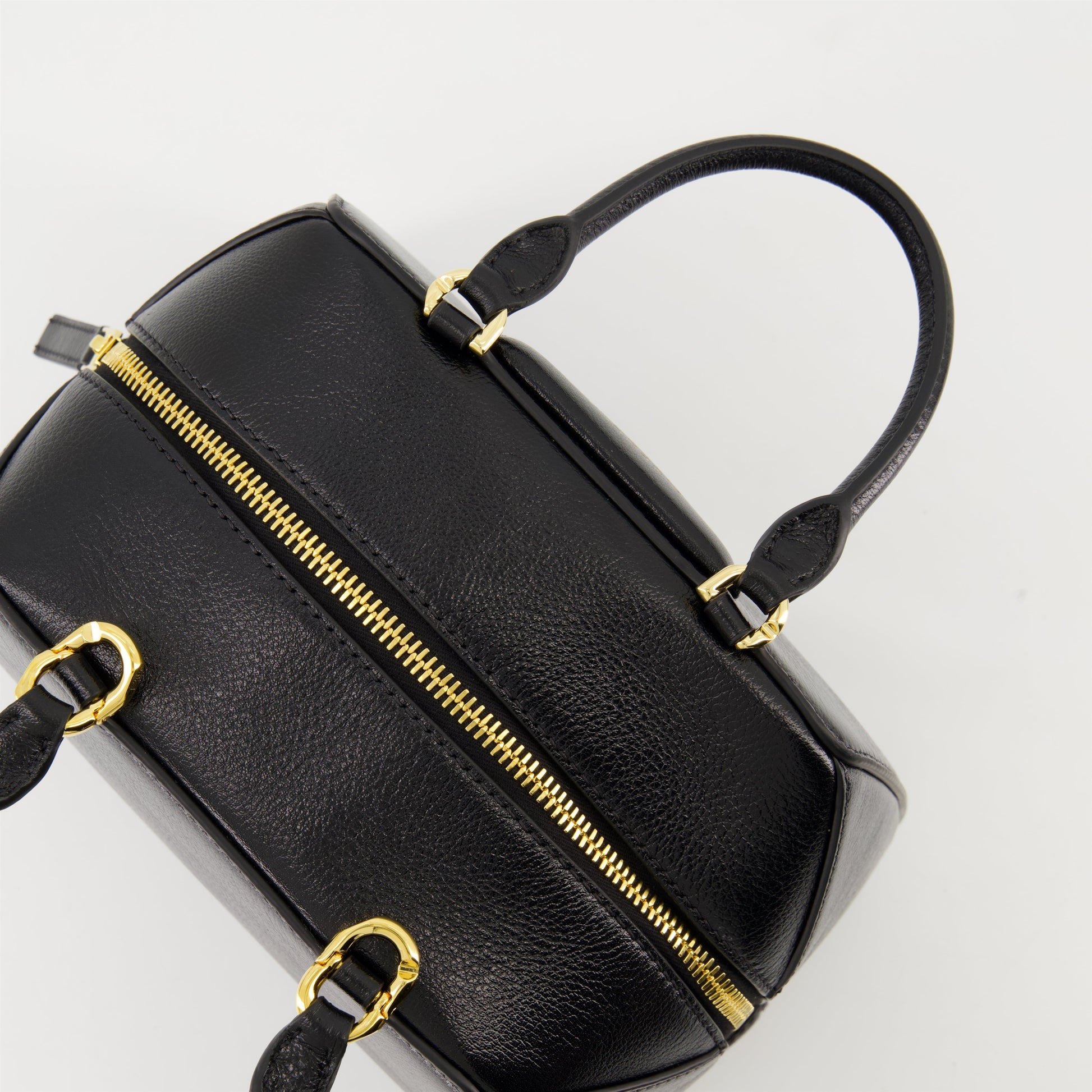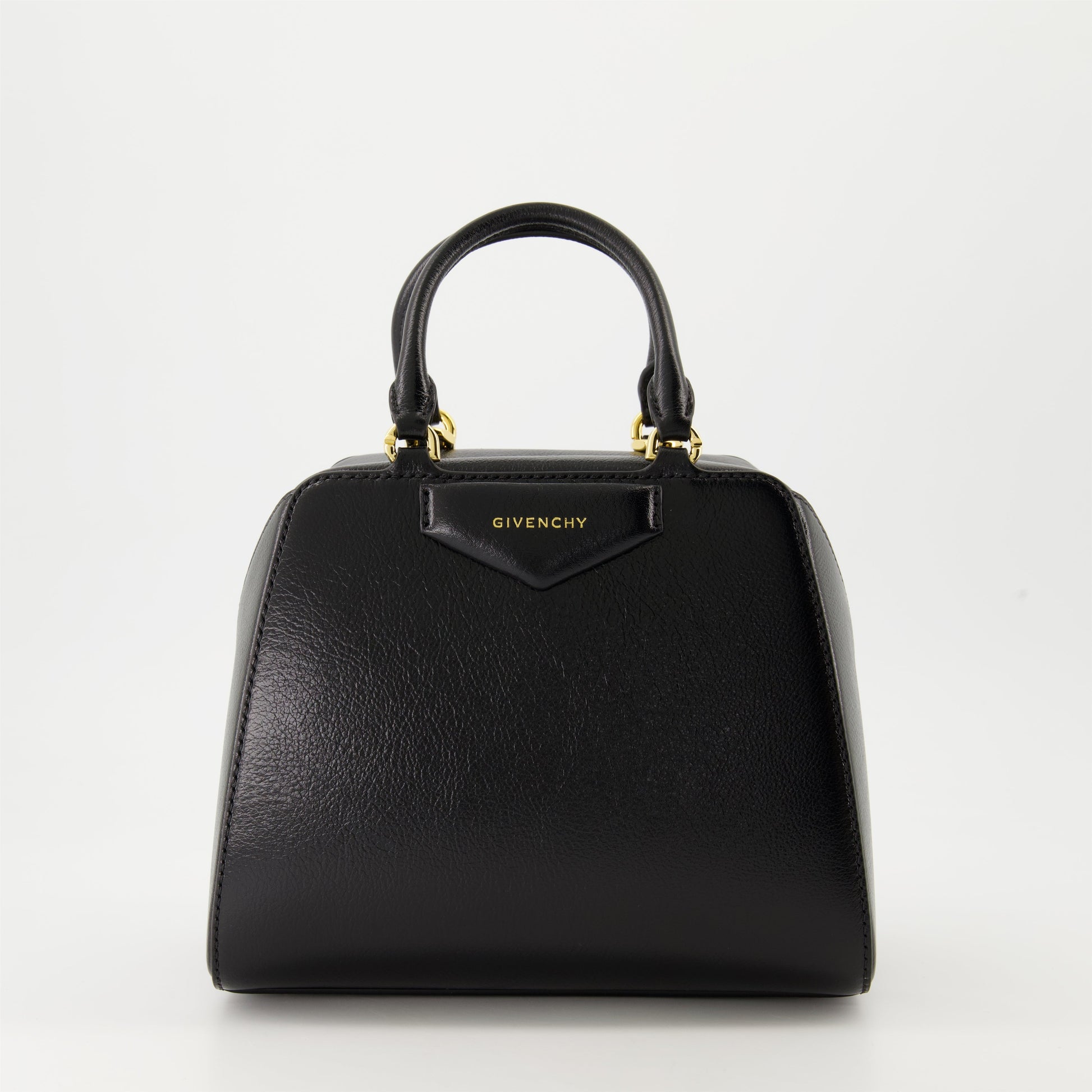 Mini Antigona Cube bag from the Givenchy Autumn-Winter 2024 collection for women. Made from slightly grained shiny buffalo leather. Solid black color. Removable and adjustable leather shoulder strap and fixed handles.