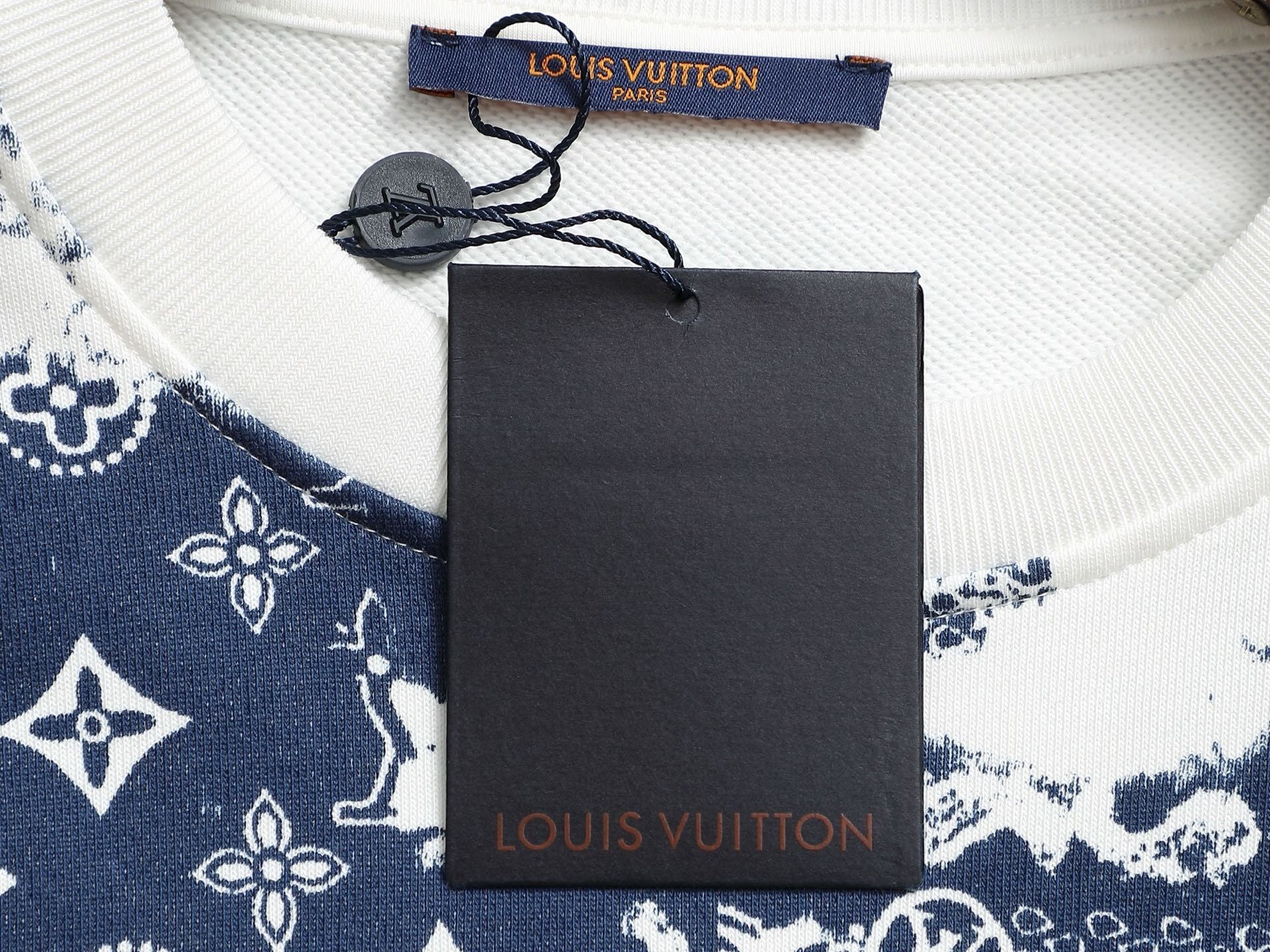 Dynamic Design: The sweatshirt features an all-over bandana-inspired pattern in striking blue tones, accented with Louis Vuitton’s signature monogram motifs for a fresh, eye-catching aesthetic.
