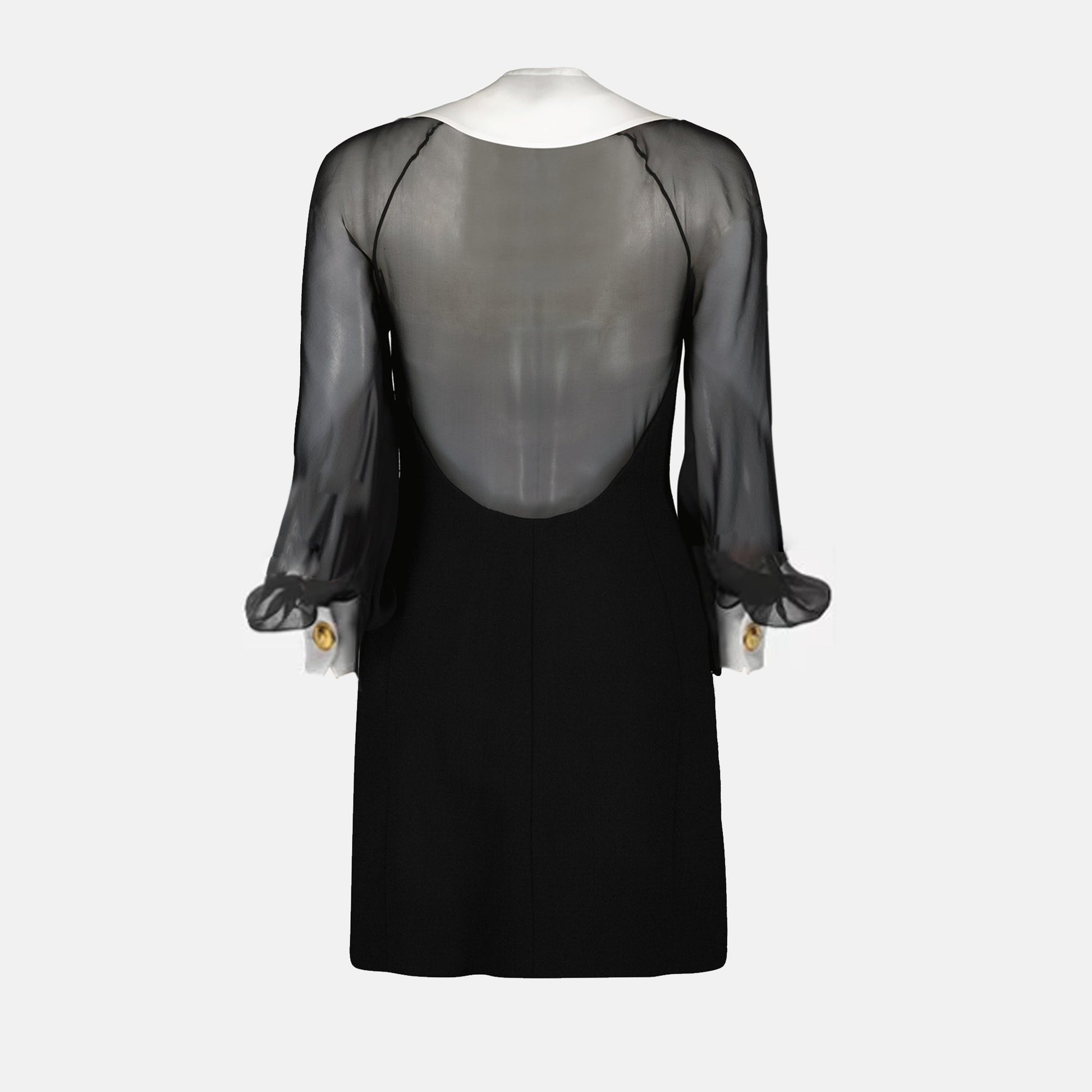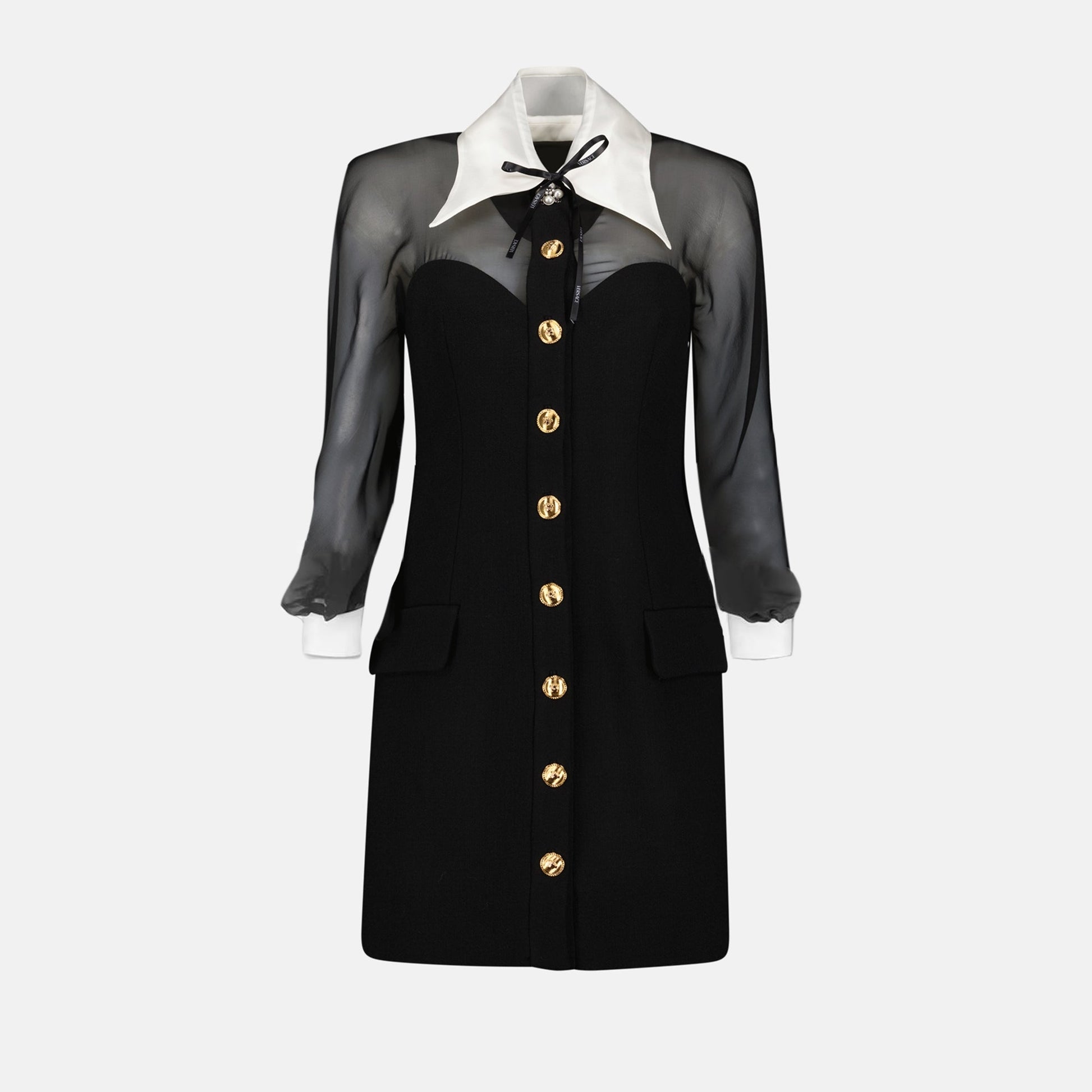 Mini strapless black dress from the Versace Autumn-Winter 2024 collection for women. Made from wool and silk. Item color: black. Pointed collar and long sleeves.