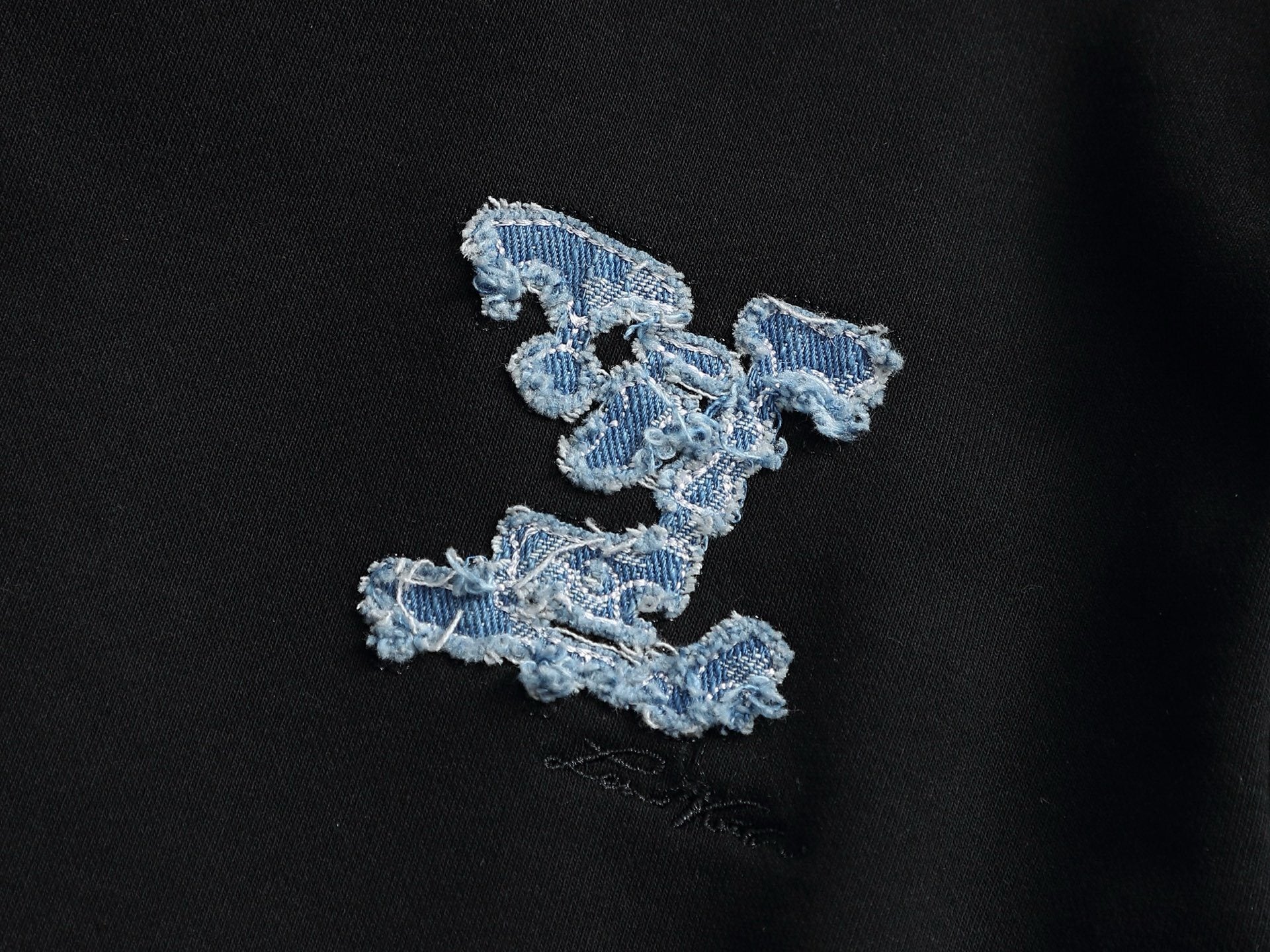 Black hoodie combines modern minimalism with iconic luxury detailing. Crafted from premium cotton for a soft, comfortable feel, it features a subtle gradient fade effect and a textured blue LV monogram patch on the chest — a refined nod to the Maison’s heritage.
