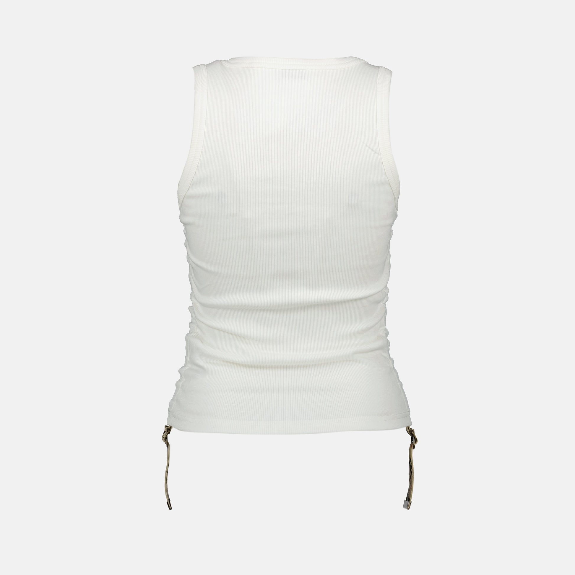 White cotton tank top from Burberry for women, Spring-Summer 2025 collection. It features a round neckline, adjustable straps, and Check plaid detailing.