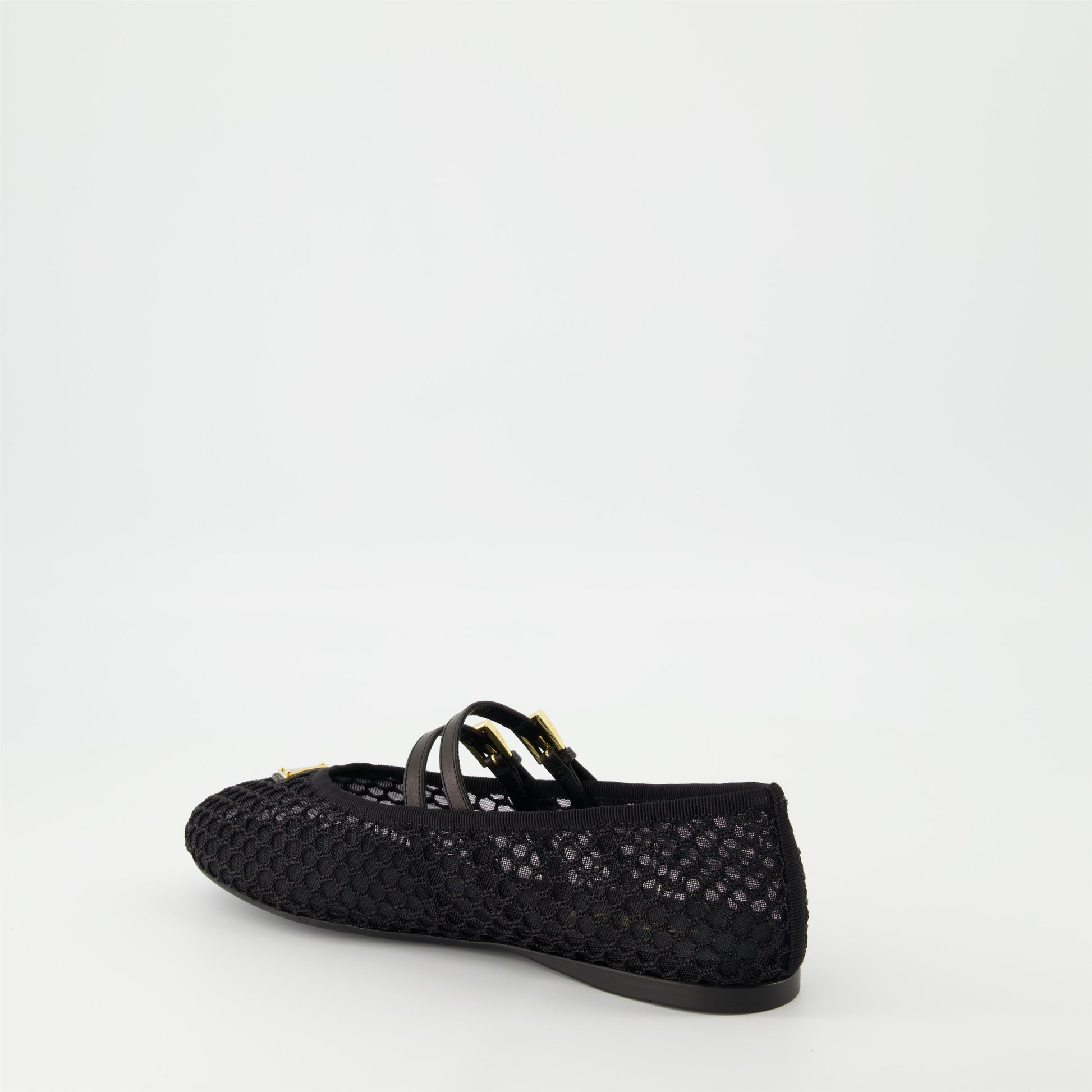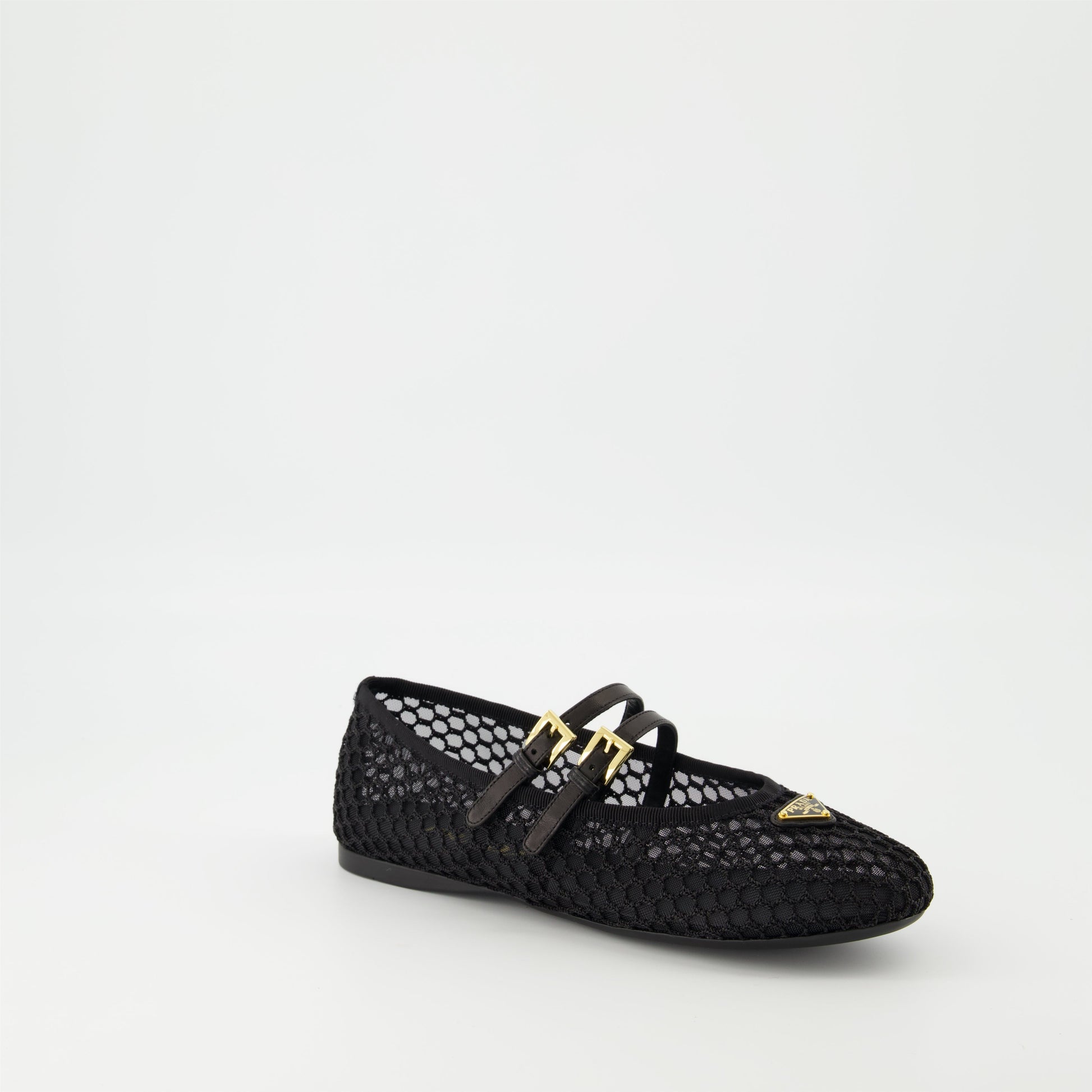Black mesh ballet flats from the brand Prada for women, combining elegance and comfort. This pair is part of the Spring-Summer 2025 collection, featuring refined and modern details.