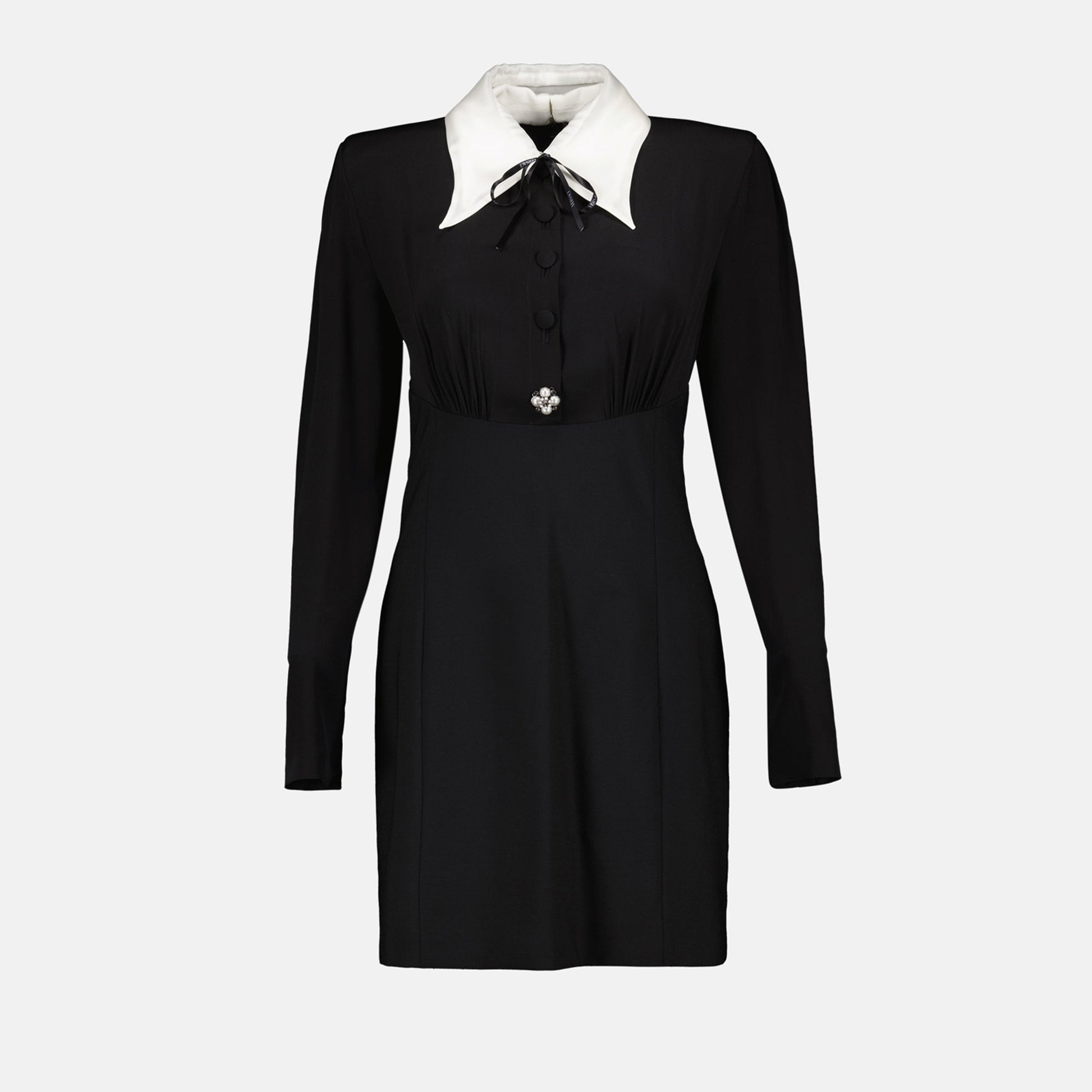 Mini black silk dress from the Versace Fall-Winter 2024 collection for Women. Made from wool and silk. Color: black. Pointed collar and long sleeves.