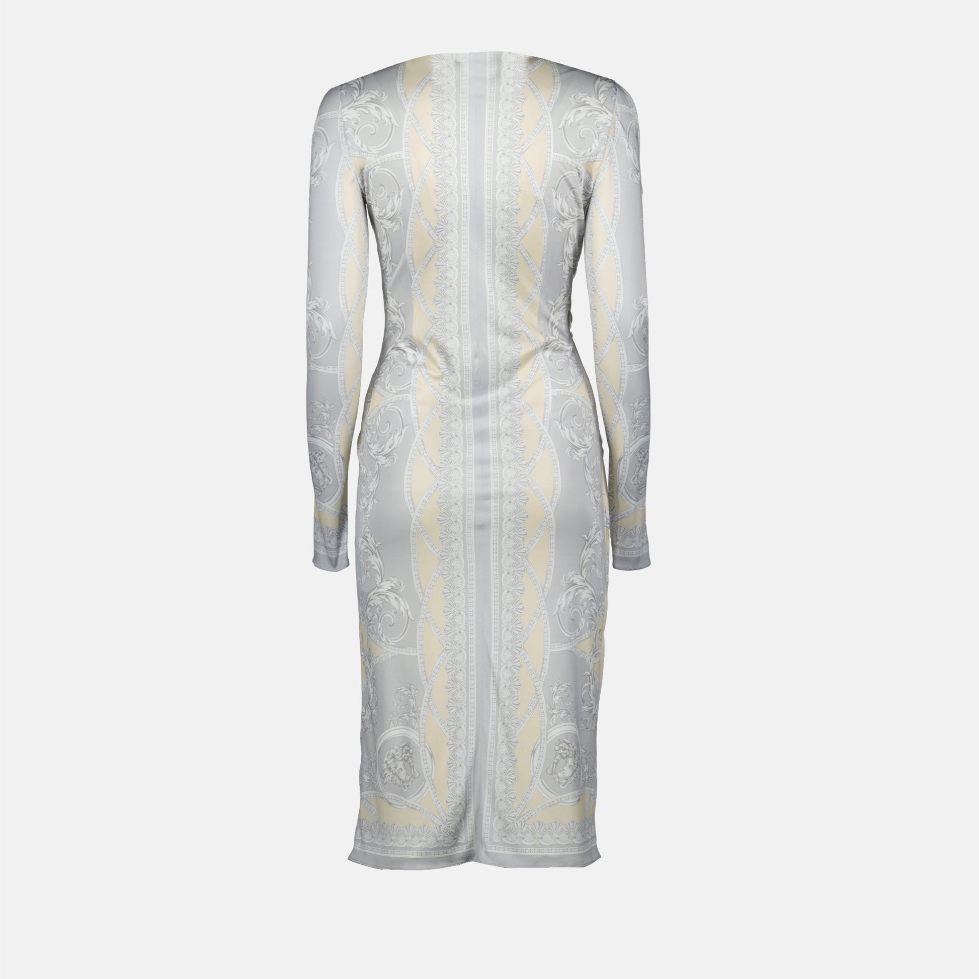 The Dress The Gods' Cut by Versace is an elegant feminine piece made of viscose. It is part of the Spring-Summer 2025 collection and features a distinctive print and draped effect.