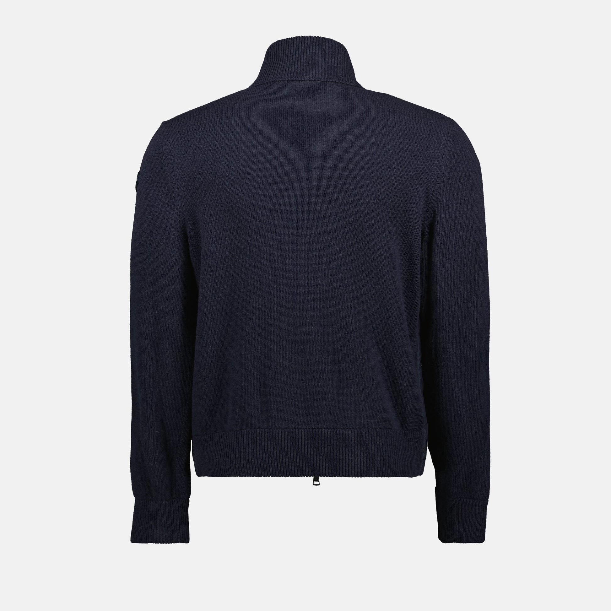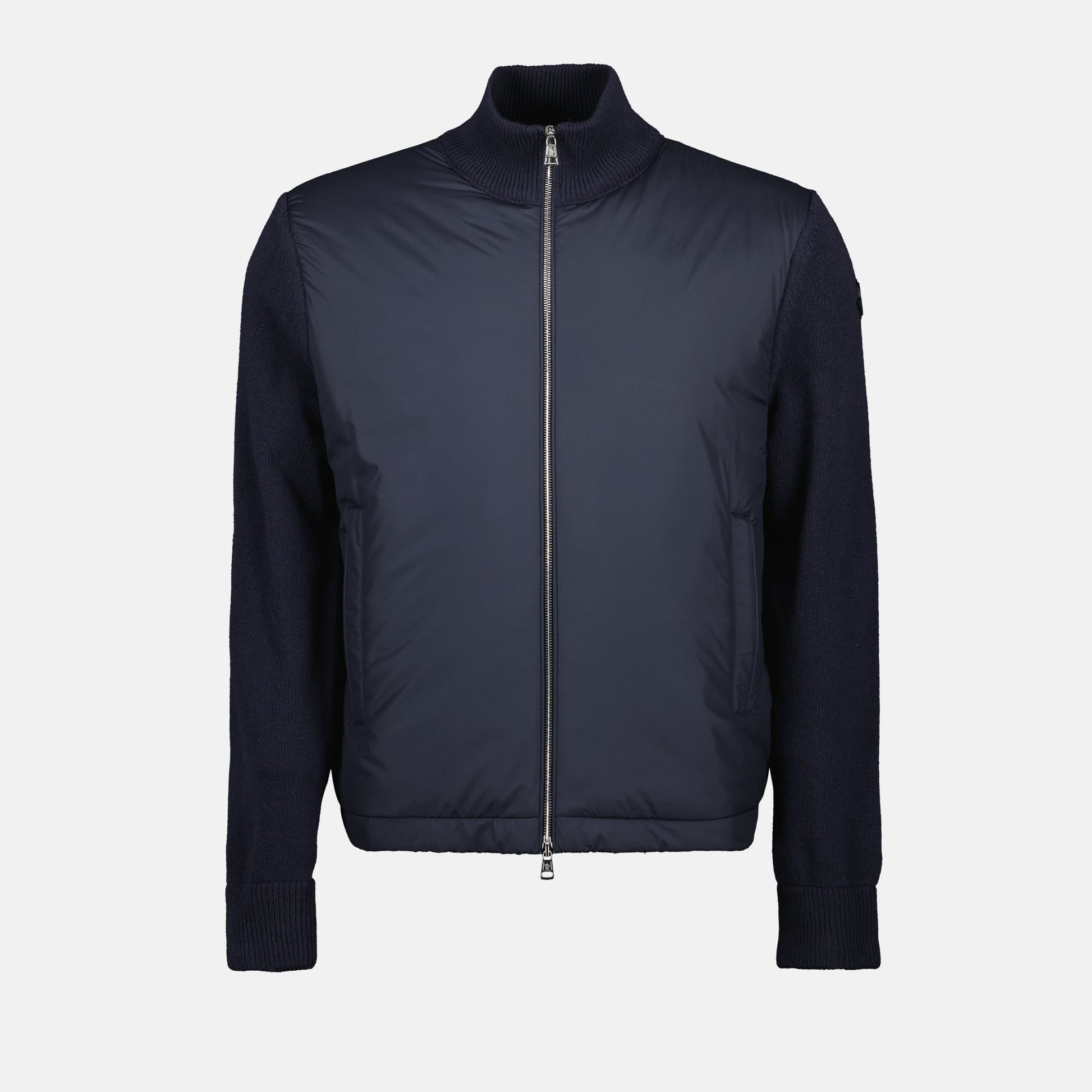 Two-material navy blue down jacket from the brand Moncler for men. This piece is part of the Spring-Summer 2025 collection and is made of wool, cashmere, and down insulation.