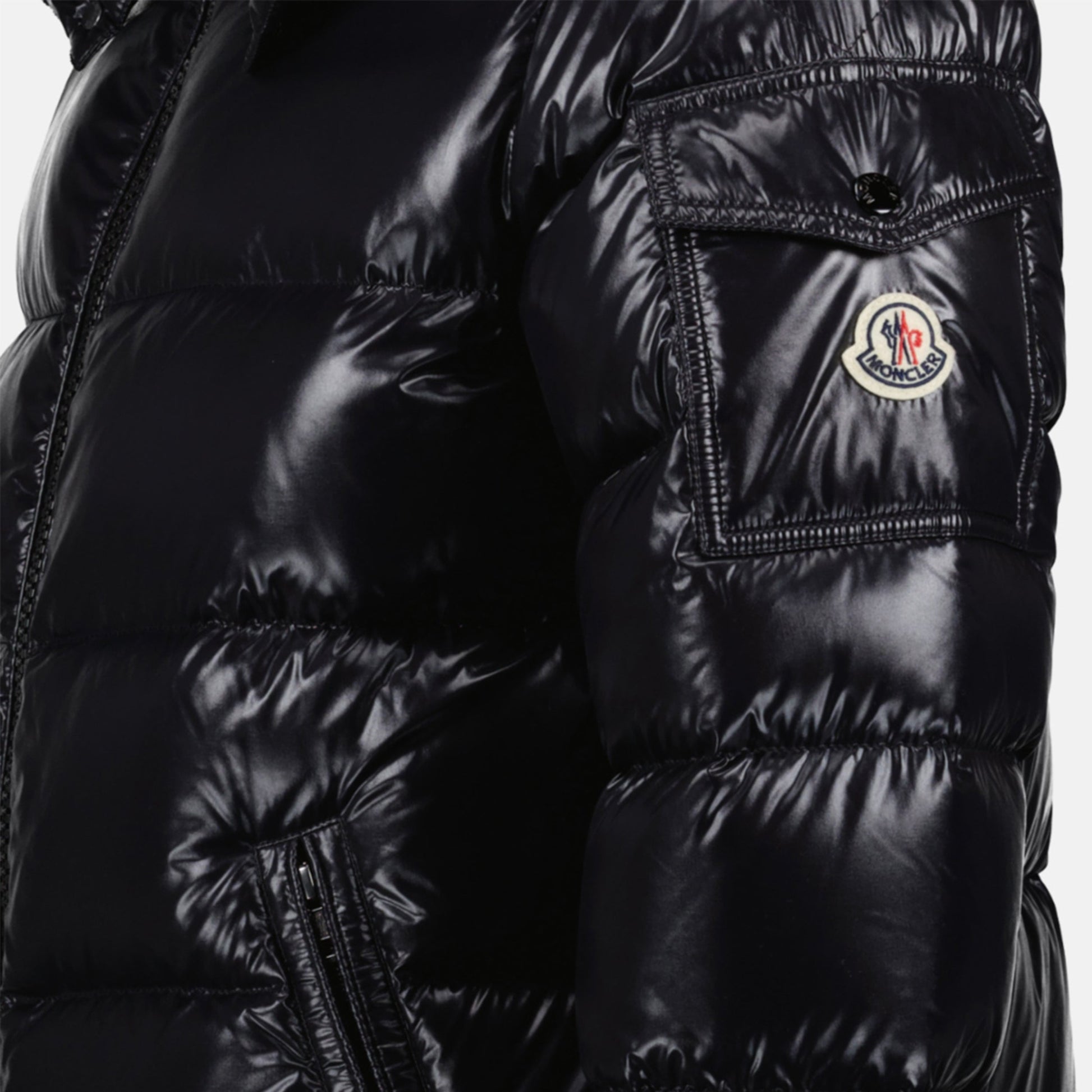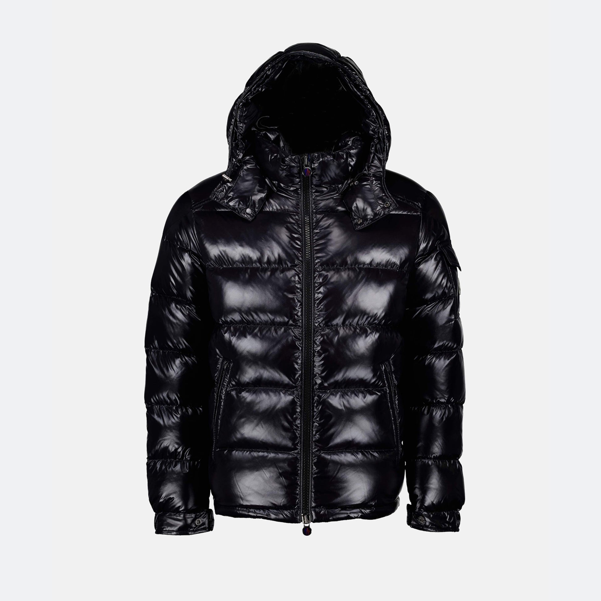 The black Maya down jacket from Moncler is a men's garment from the Autumn-Winter 2025 collection. It is made of polyamide with down padding for optimal warmth.