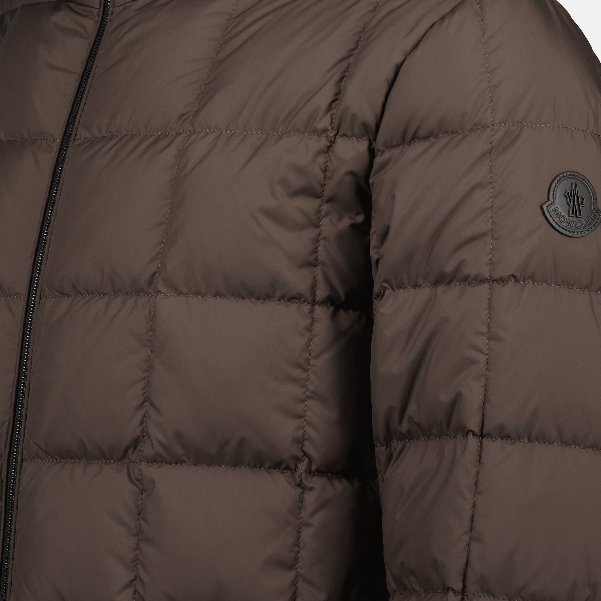 Reversible Livra down jacket from Moncler for men, made from polyester and acrylic. It is part of the Fall-Winter 2025 collection, featuring down padding and nubuck leather details.