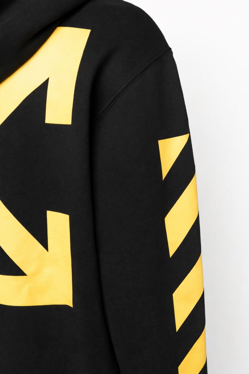 This Off-White™ hoodie is a signature expression of the brand’s graphic language and contemporary street-luxury aesthetic. Crafted from premium cotton jersey, the design features the iconic yellow Arrows motif boldly printed across the back, paired with the recognizable diagonal stripe detailing along the sleeves.