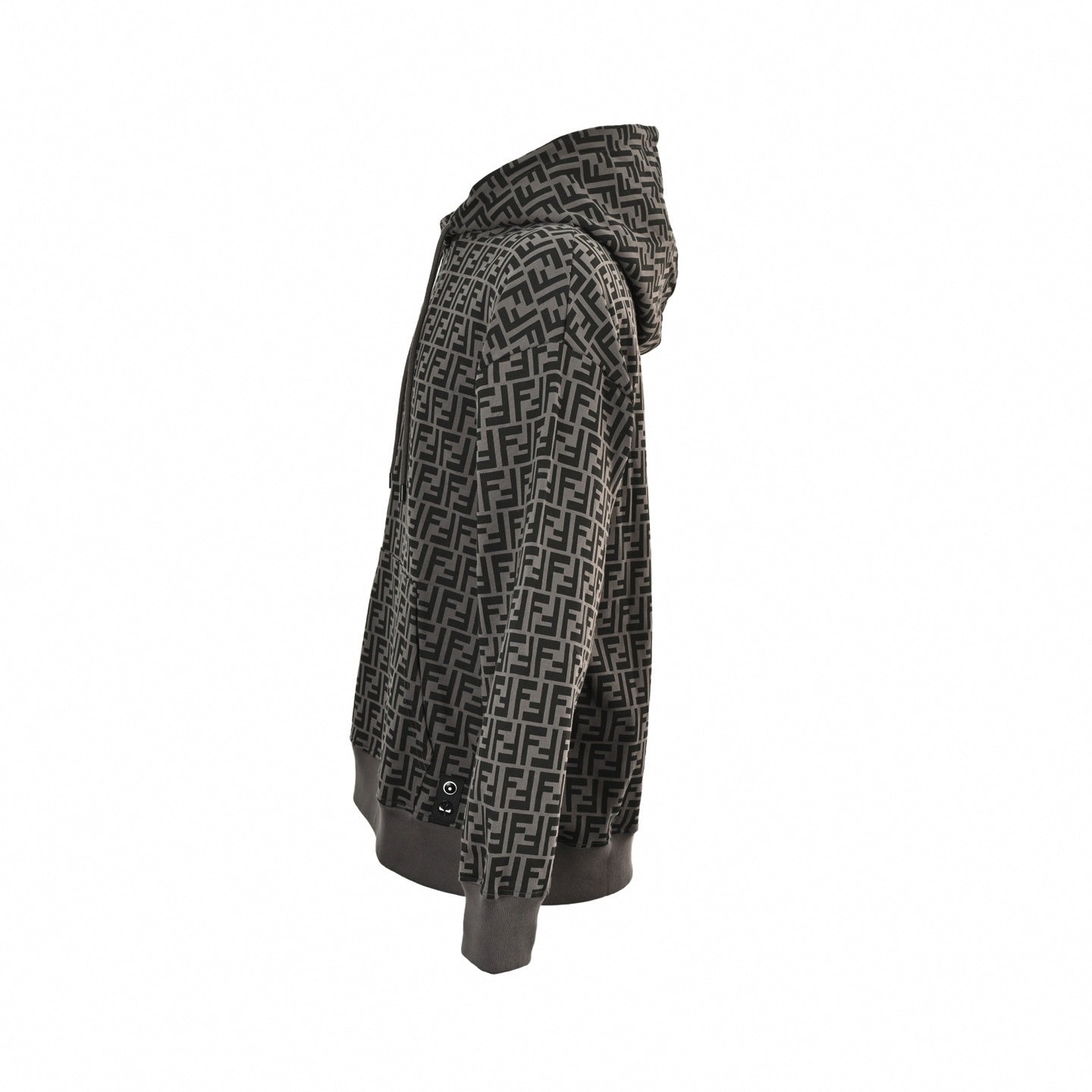 This Fendi FF Monogram Hoodie delivers bold luxury with its iconic all-over FF print in grey and black. Crafted from premium fabric, it combines high-end style with everyday comfort. The hoodie features an adjustable drawstring hood, a roomy kangaroo pocket, and ribbed cuffs and hem for a polished fit. A standout designer piece, perfect for elevating streetwear or adding a statement layer to any outfit.