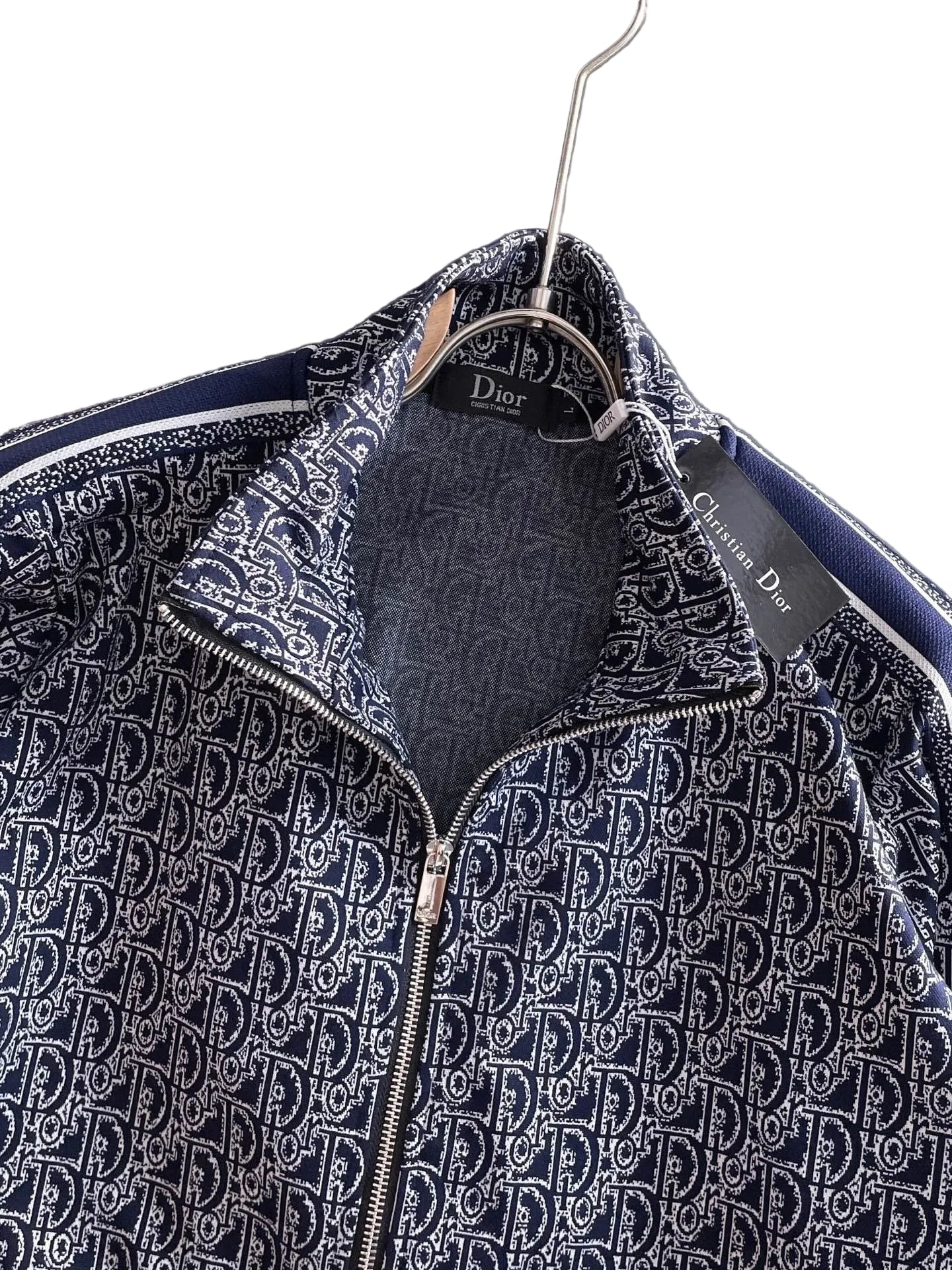 This Dior tracksuit showcases the House’s iconic Oblique motif in a refined navy and ivory palette. Crafted from a soft, structured knit, the set combines everyday comfort with unmistakable couture identity. The zip-up track jacket features a stand collar and contrasting side bands signed Christian Dior, while the matching joggers echo the same graphic codes for a cohesive silhouette. Finished with ribbed trims and a relaxed yet polished cut, this set embodies Dior’s modern vision of elevated sportswear.