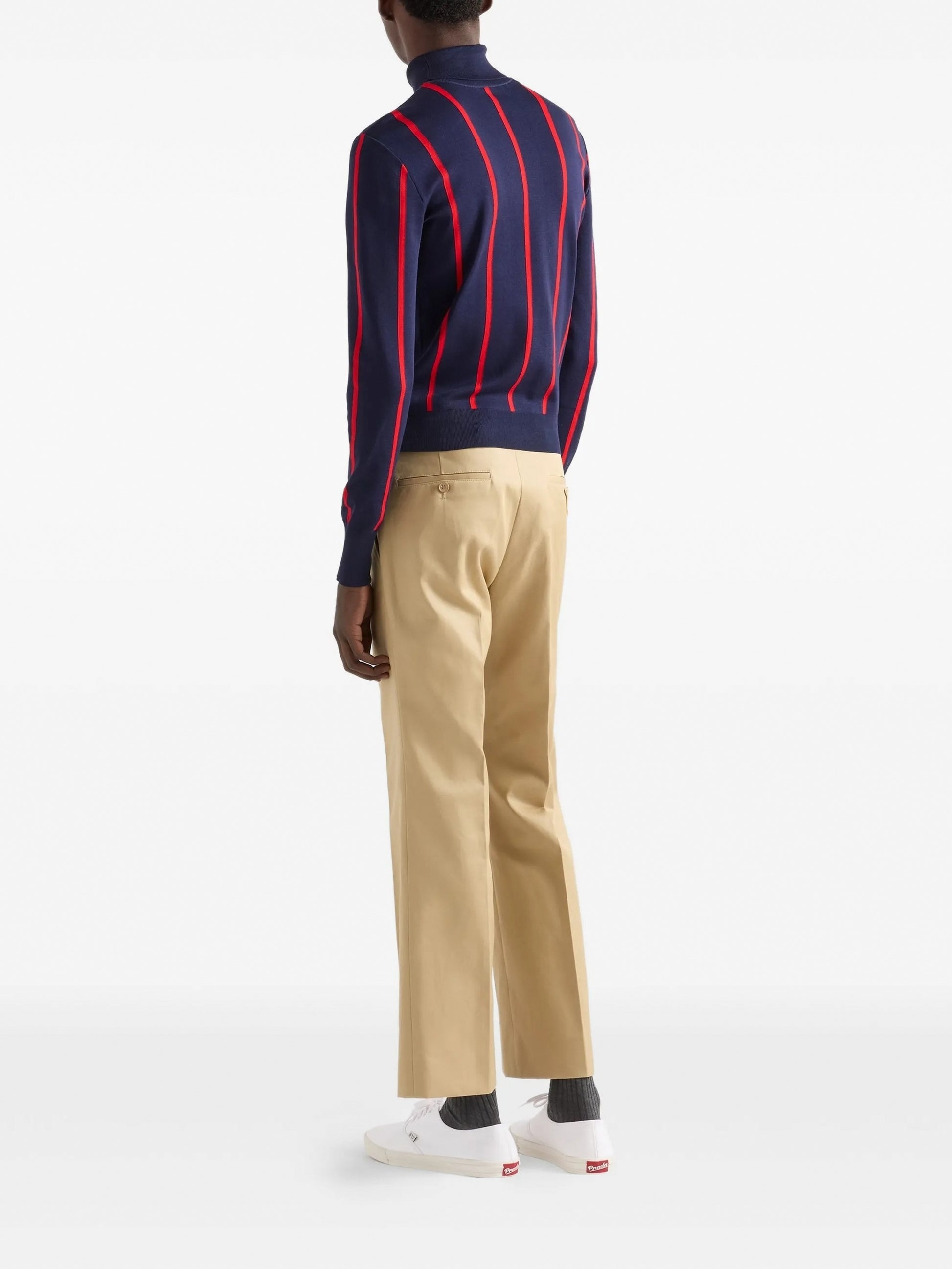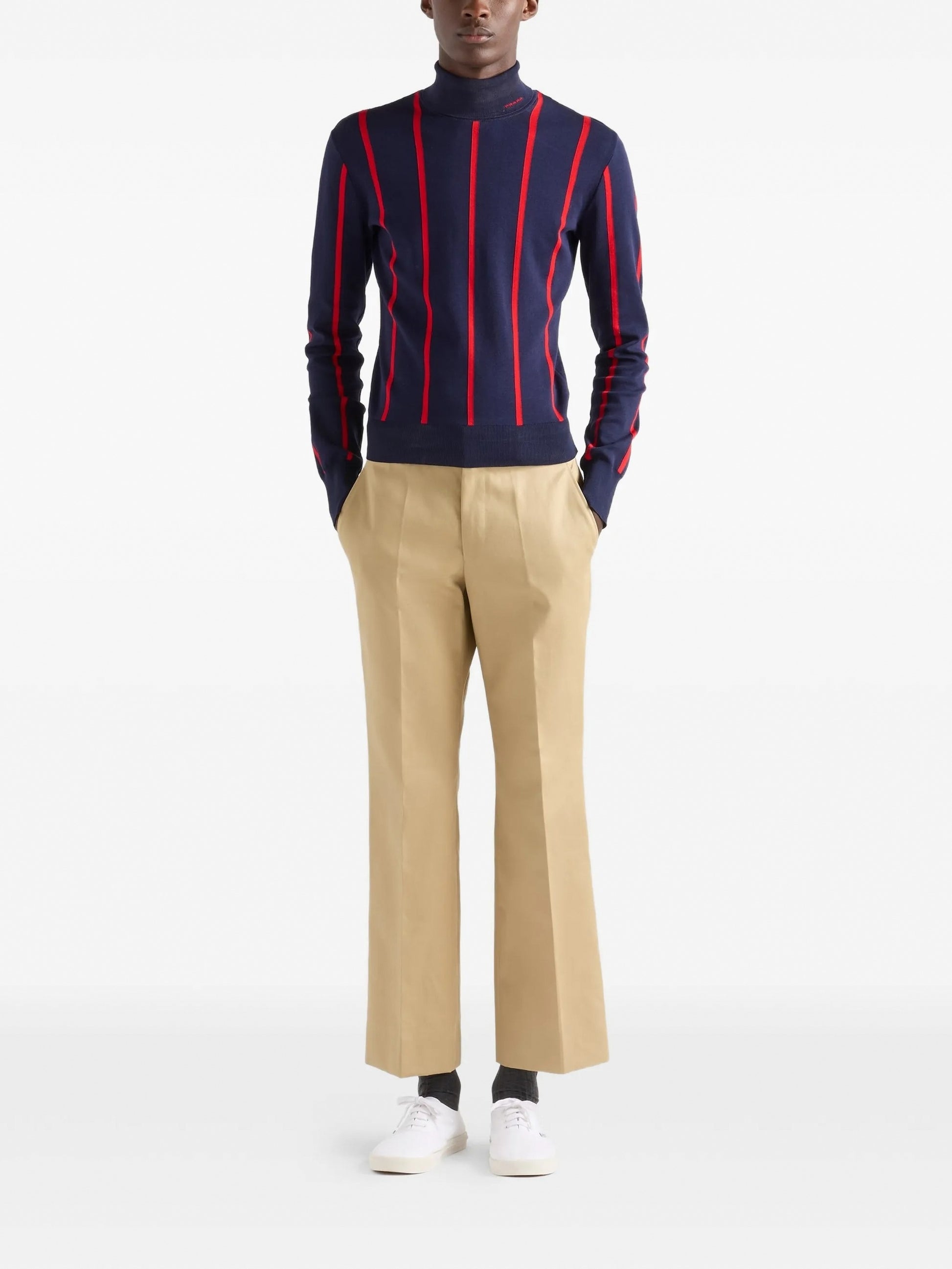 Presented on the runway, this Prada intarsia sweater captures the house’s modernist approach to knitwear. Crafted from fine wool, the design features bold vertical stripes rendered through precise intarsia technique, creating a graphic yet refined visual rhythm. A structured turtleneck and clean silhouette lend architectural elegance, while subtle Prada branding at the collar underscores the piece’s understated luxury. A statement knit that balances innovation, craftsmanship, and timeless sophistication.
