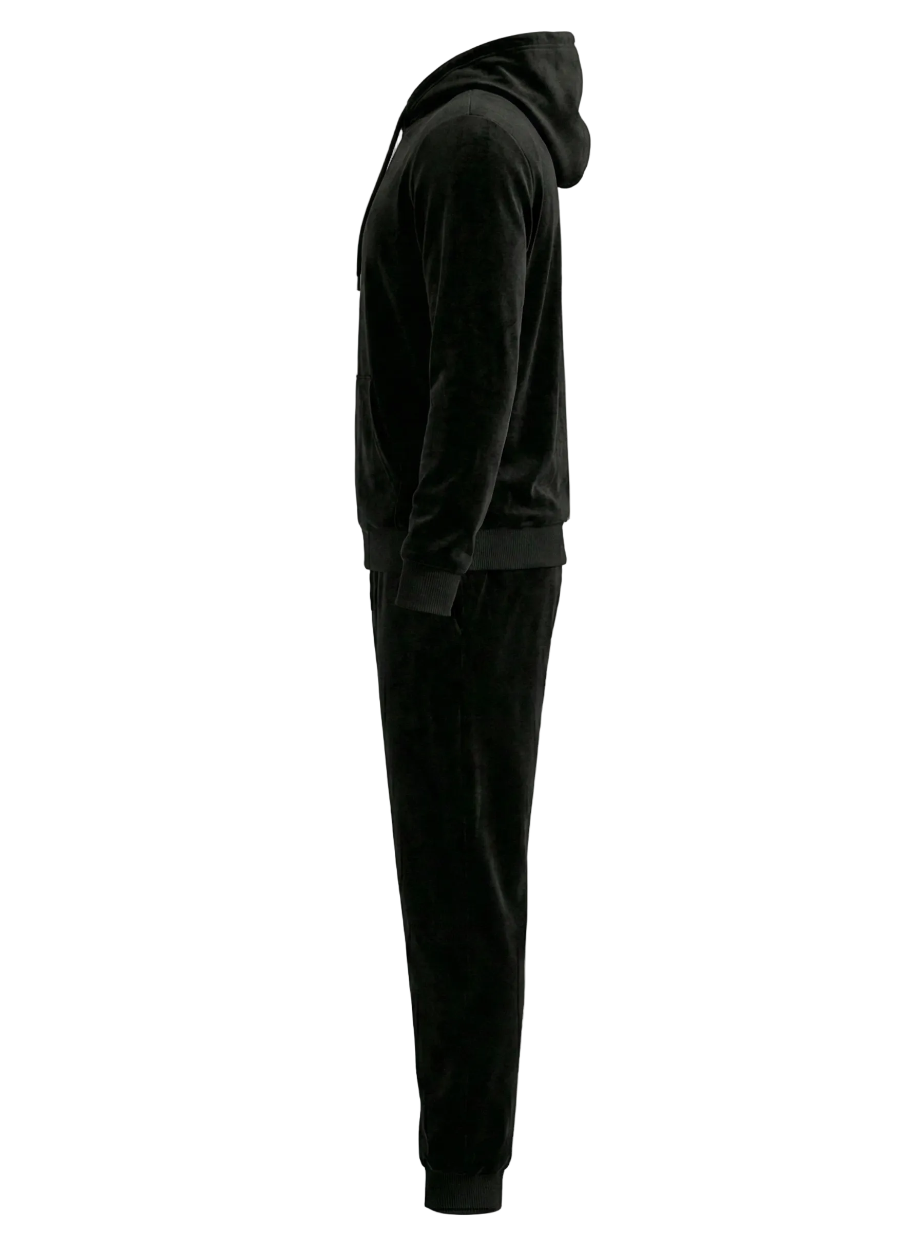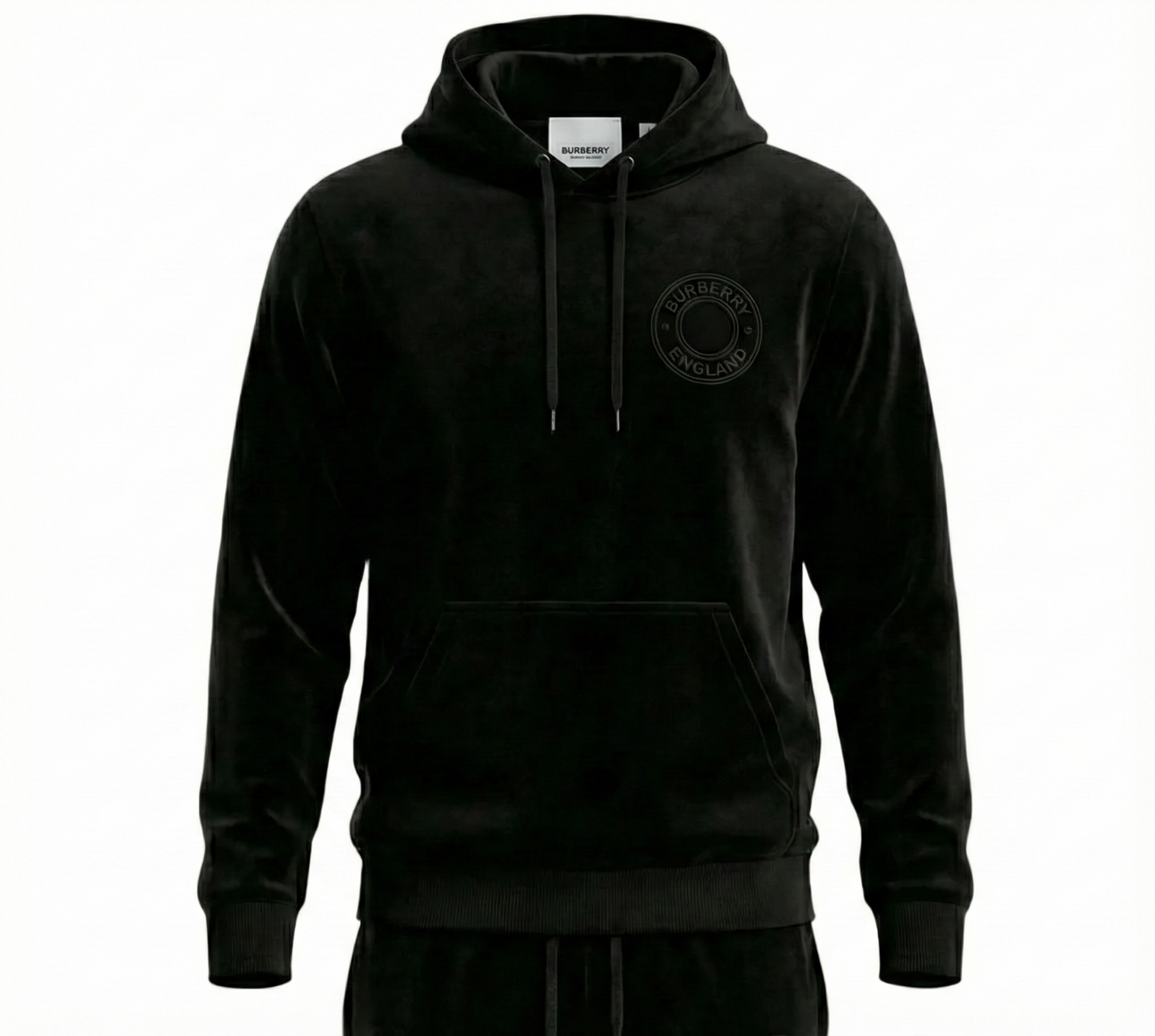 This black velour tracksuit from Burberry reflects the House’s signature balance of refinement and modern ease. Crafted from plush velour with a soft, luxurious hand feel, the set delivers exceptional comfort while maintaining a clean, contemporary silhouette. The hooded sweatshirt is designed with a relaxed structure and classic kangaroo pocket, while the coordinating trousers feature a streamlined, tapered shape. Subtle tonal Burberry branding adds a discreet yet distinctive finish, making this tracksuit ideal for elevated off-duty wear.