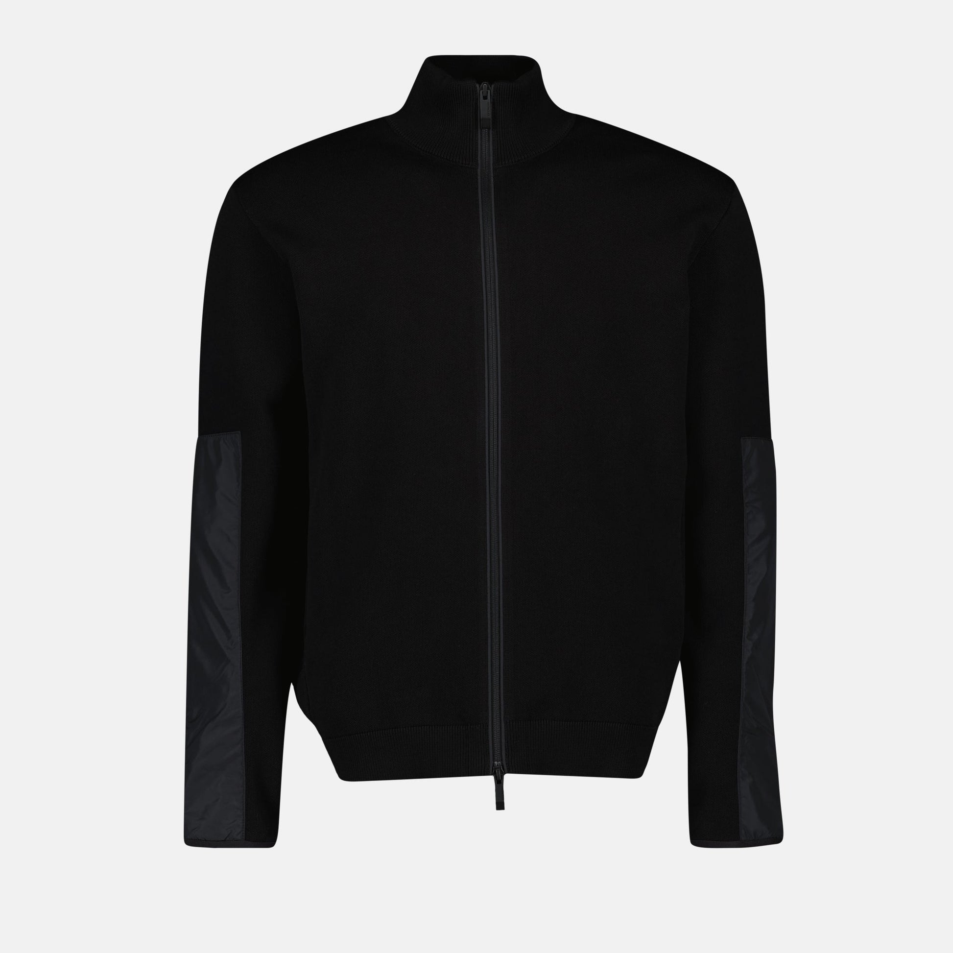 Black zipped cotton jacket by Moncler for men, from the Autumn-Winter 2024 collection. It features a high collar, long sleeves, and nylon inserts on the sleeves.