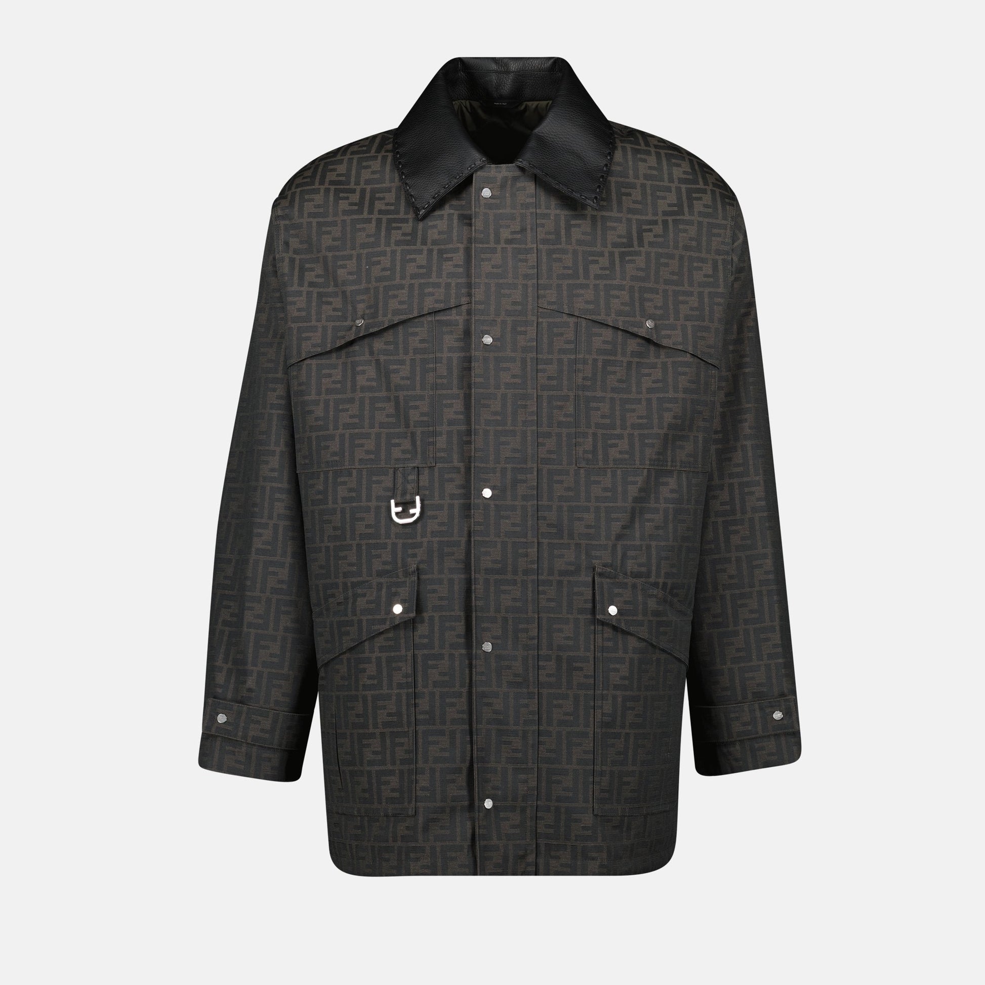 Brown FF print jacket from Fendi for men, from the Autumn-Winter 2024 collection. This model made of cotton and polyester features a high collar and an all-over FF print.