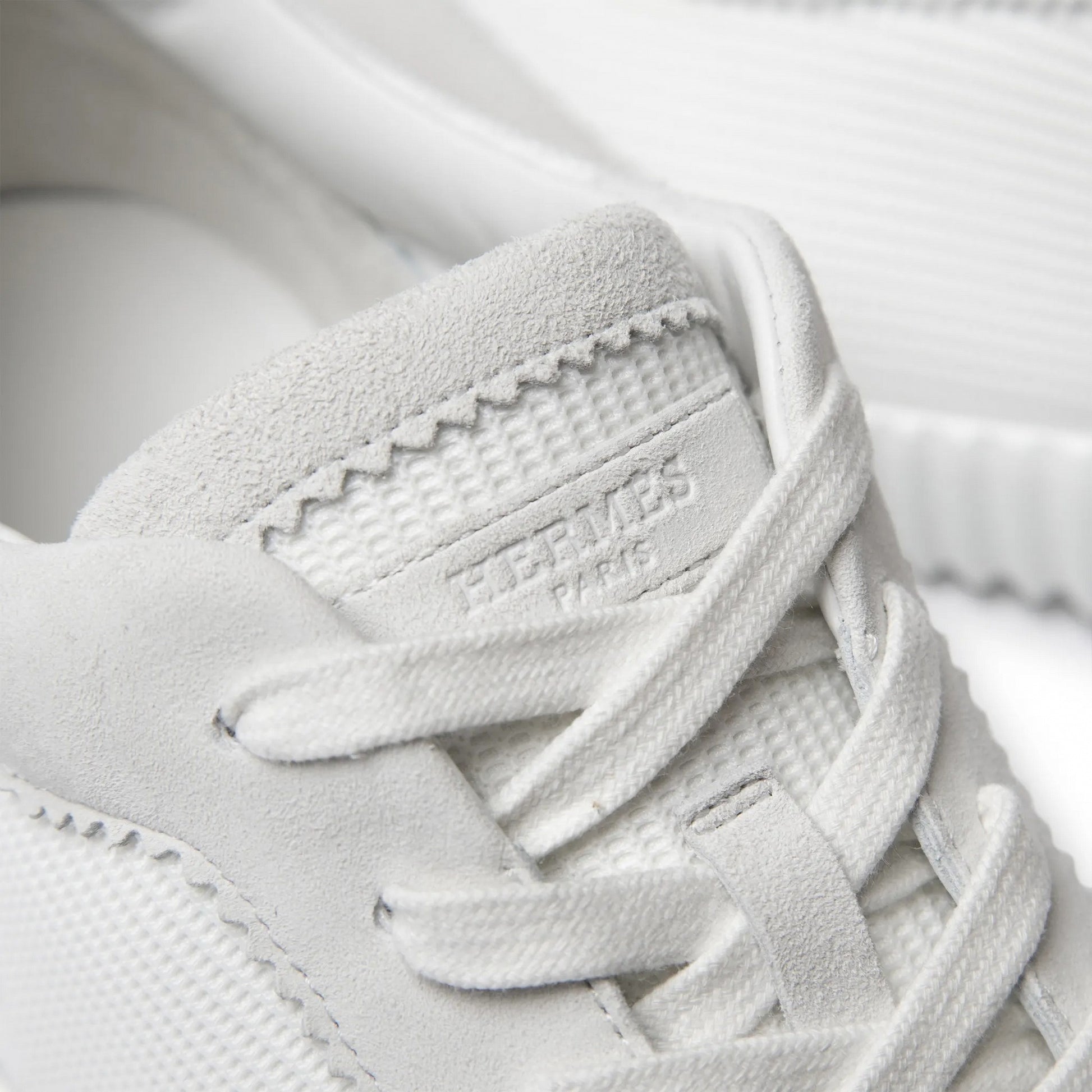 Set atop the brand’s signature grooved rubber sole with the distinctive “H” insert at the heel, this sneaker ensures comfort, flexibility, and a bold touch of Hermès design identity. Its crisp all-white palette exudes contemporary sophistication, making it a versatile choice for any refined casual look.
