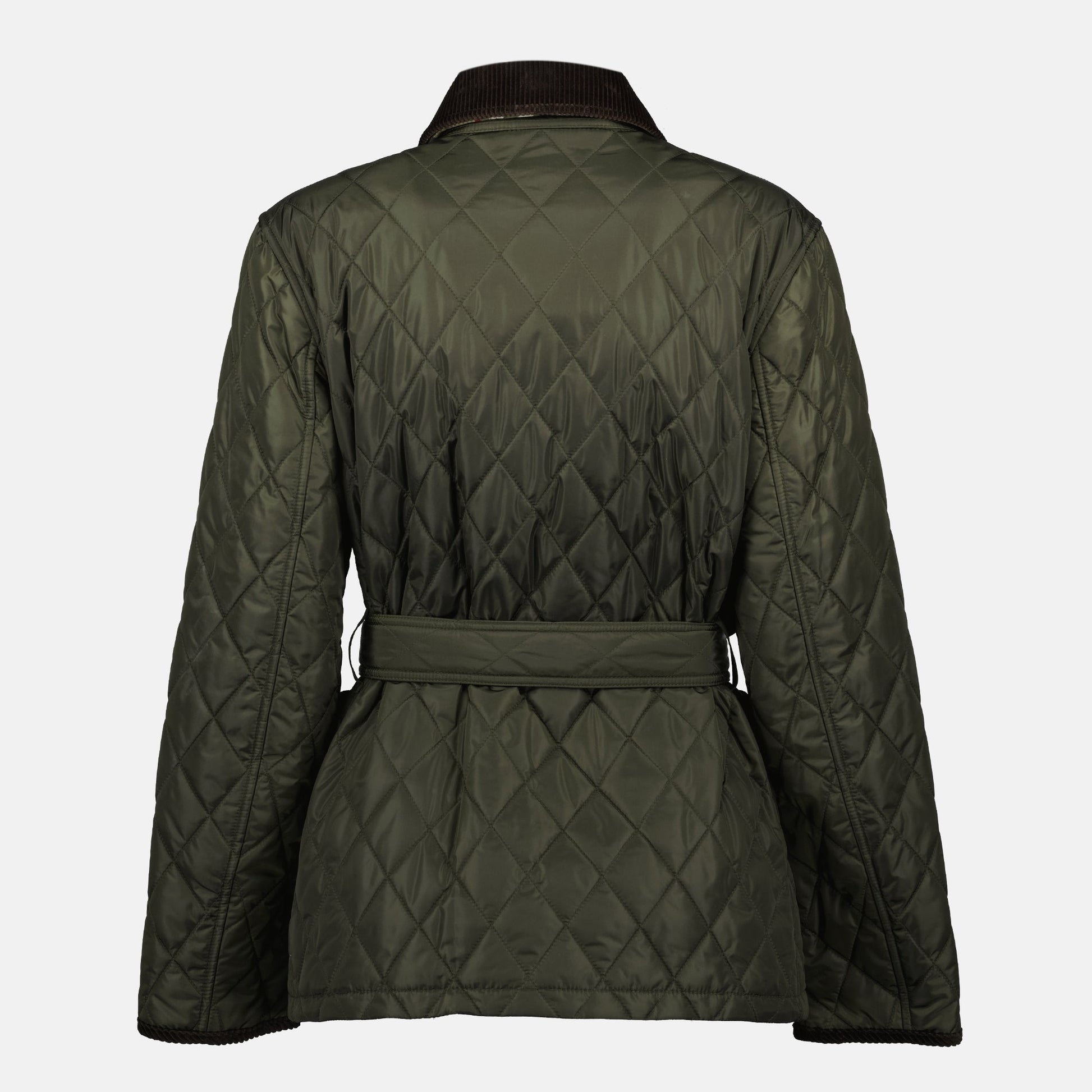 Kaki quilted jacket from Burberry for women, from the Autumn-Winter 2025 collection. It features a classic collar, long sleeves, and a fitted silhouette with an adjustable belt.
