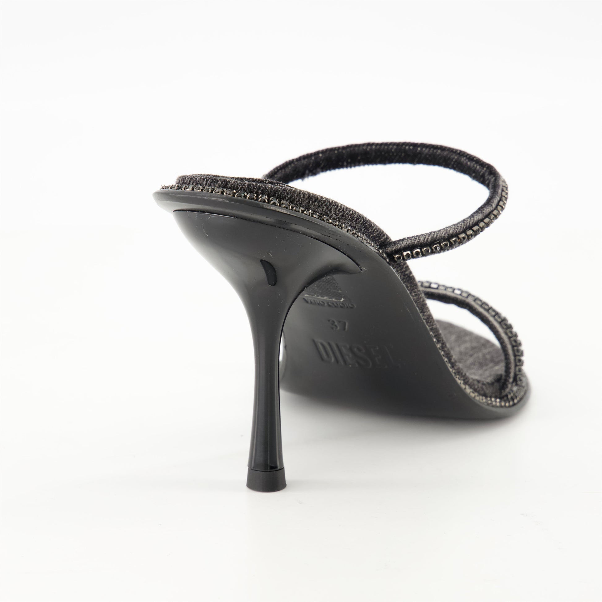 The D-havanna SDL heeled sandals in black denim by Diesel are designed for women. They are part of the Spring-Summer 2025 collection and feature crystal embellishments.