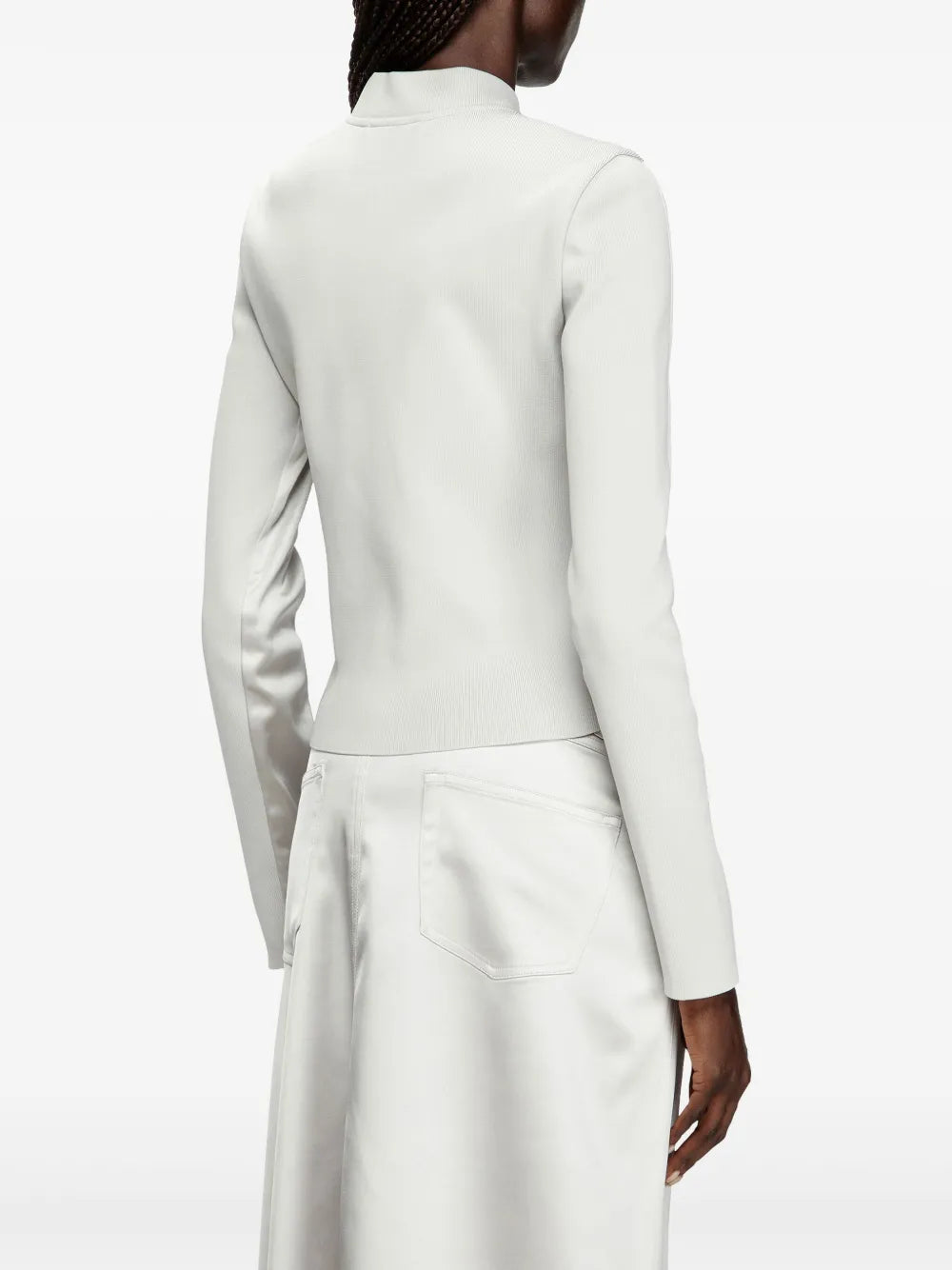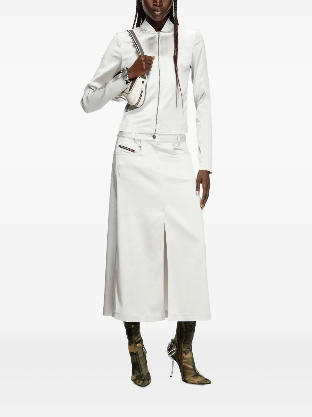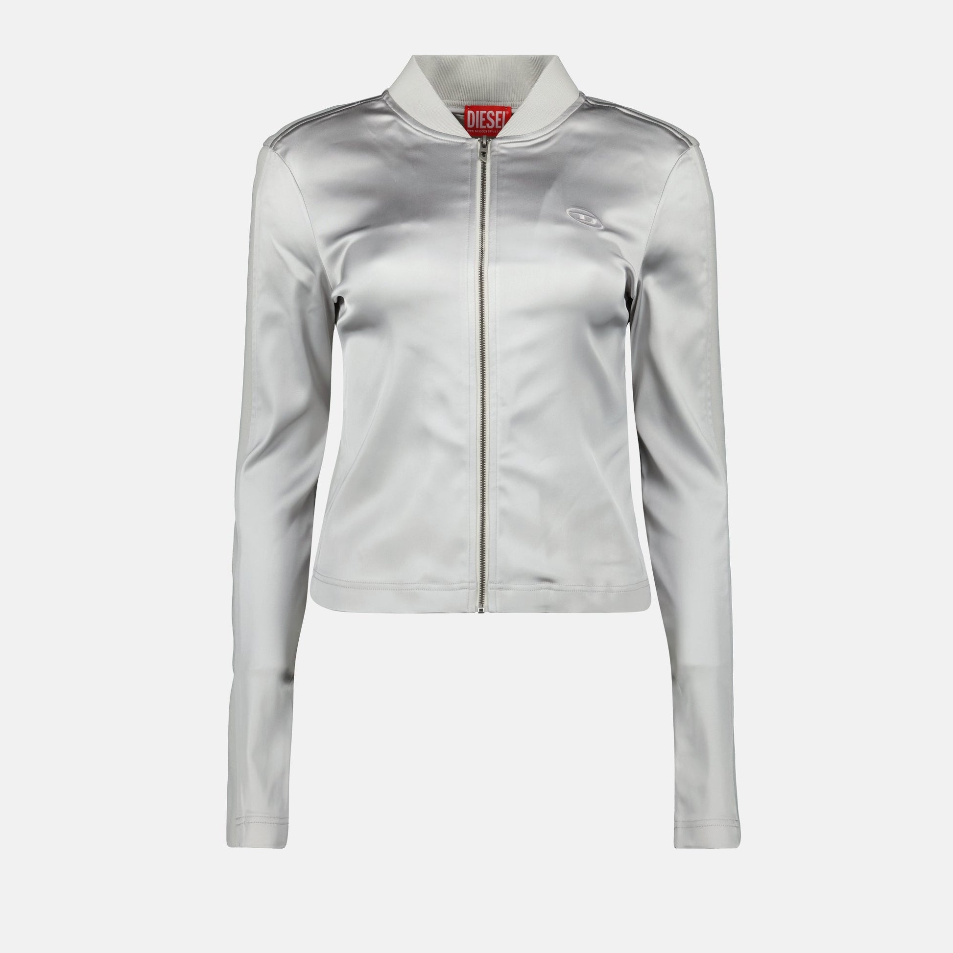 The G-Oper jacket in stretch satin from the brand Diesel is a feminine piece from the Spring-Summer 2025 collection. It features a ribbed bomber collar and an embroidered logo on the chest.