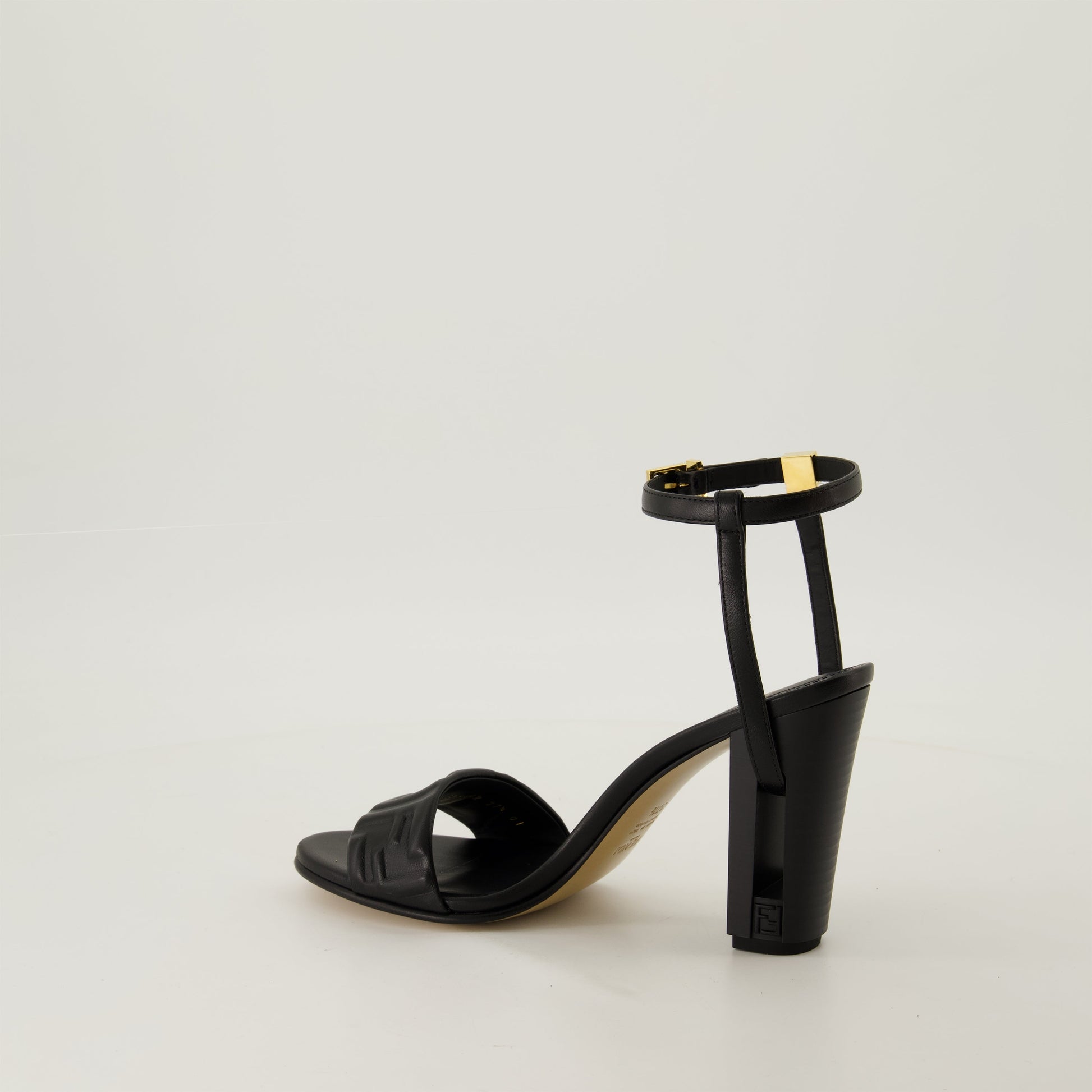 The black Delfina heeled sandals in leather from Fendi for women feature adjustable straps and a printed resin heel. They are part of the Fall-Winter 2024 collection.