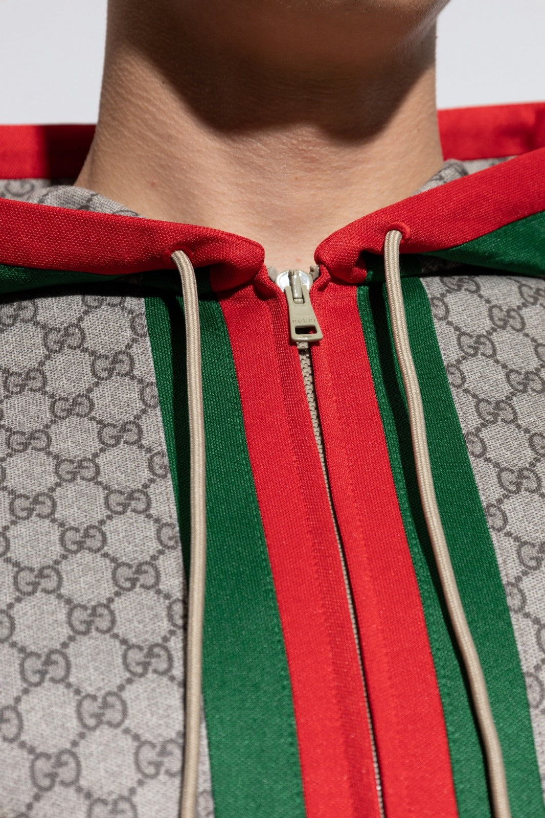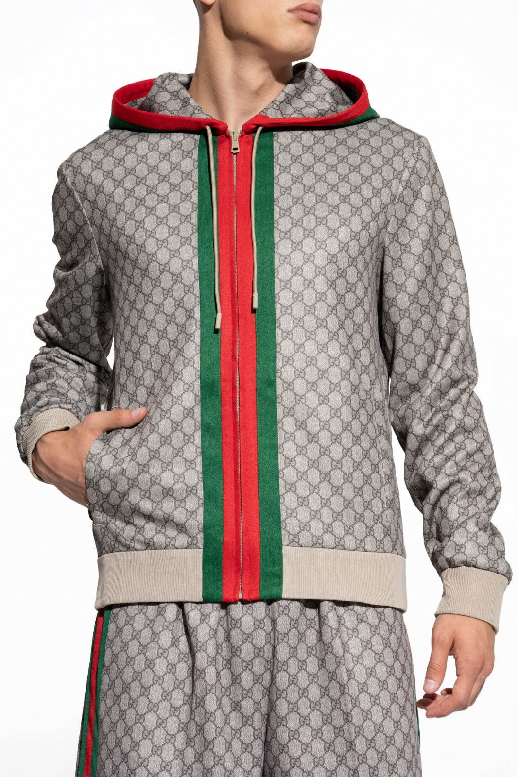 Made from beige fabric covered with the brand's distinctive "GG" monogram, the jacket has a classic hoodie cut, giving it a sporty yet elegant look. The hood is adorned with contrasting red trim, and a vertical stripe in the brand's classic colors—green and red—runs down the center of the jacket.
