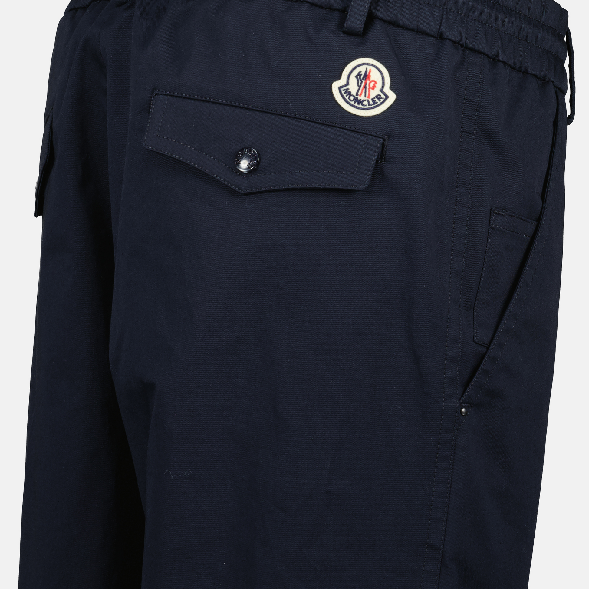Blue cotton pants from Moncler for men, from the Spring-Summer 2025 collection. It features a straight cut with practical details and a felt logo.
