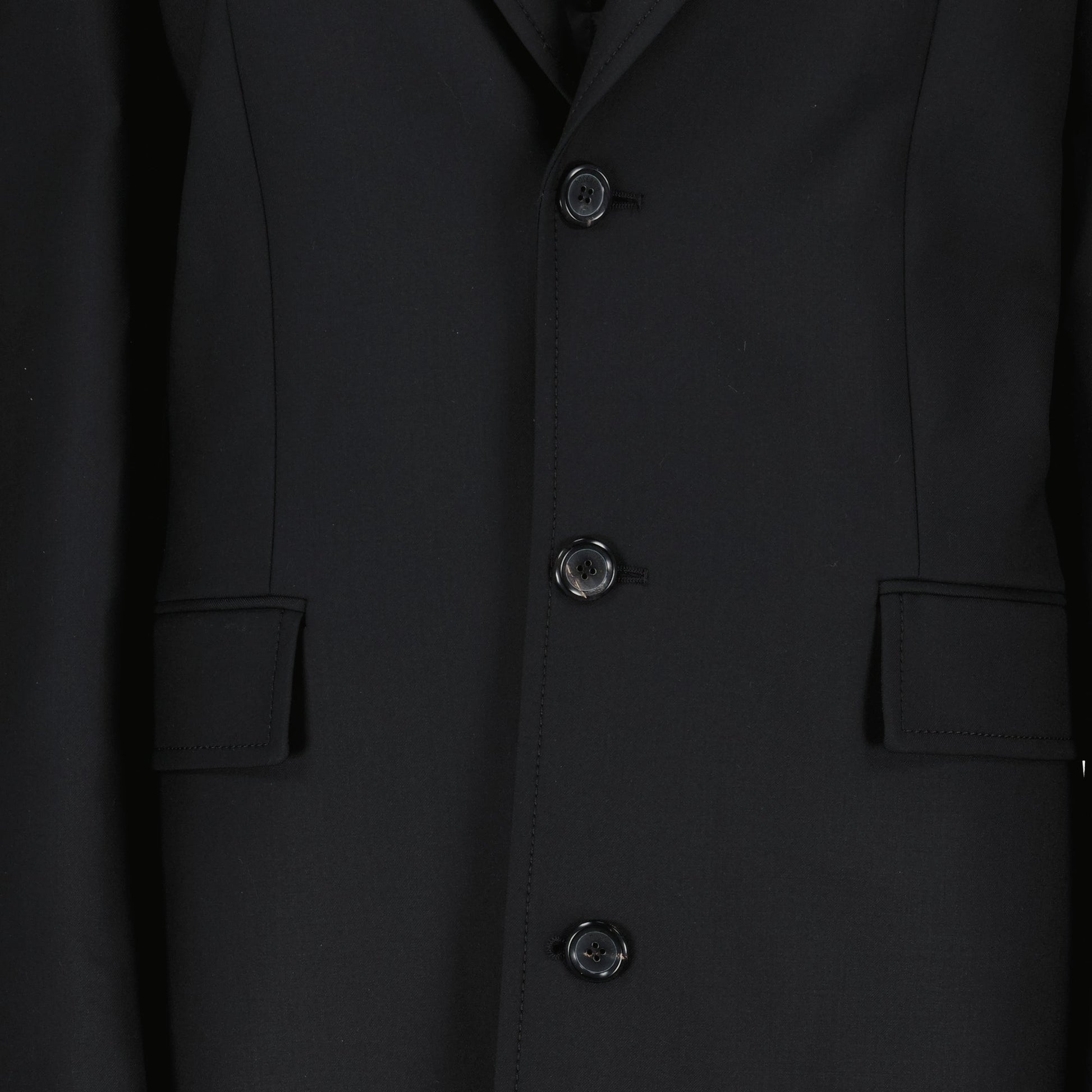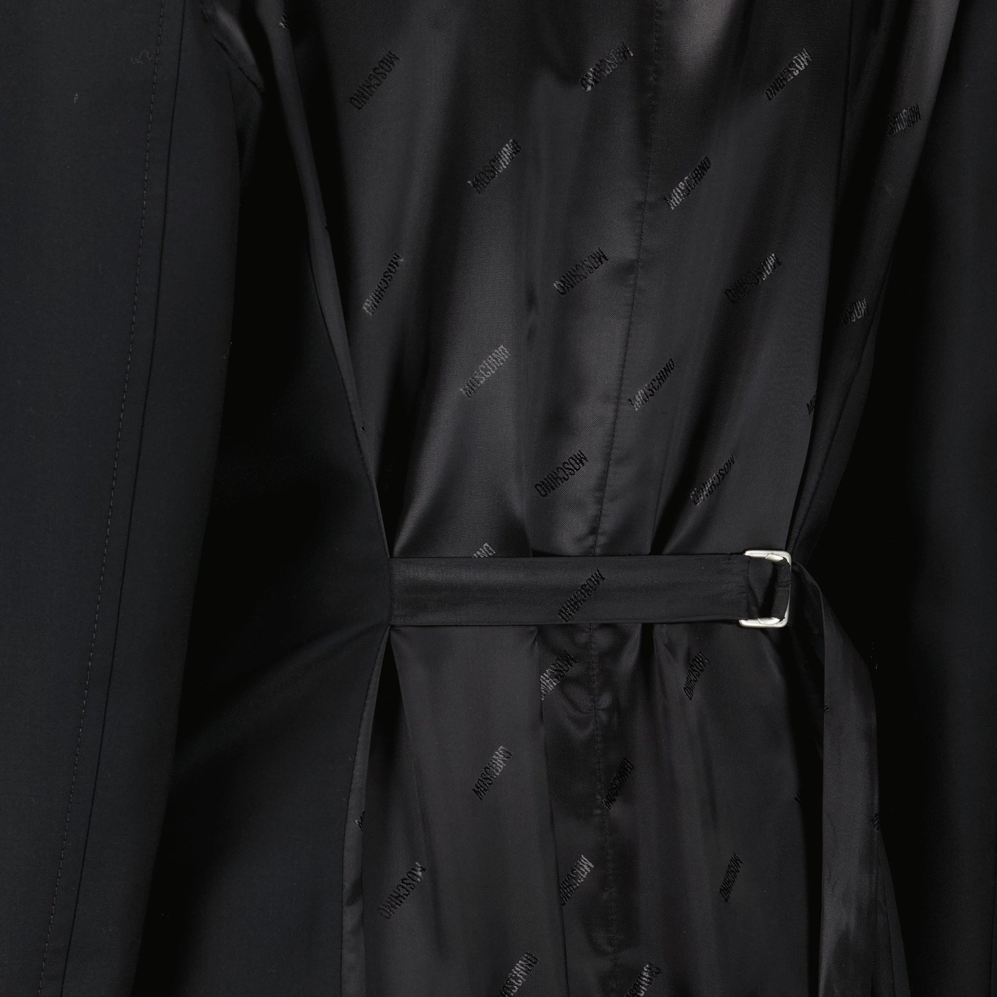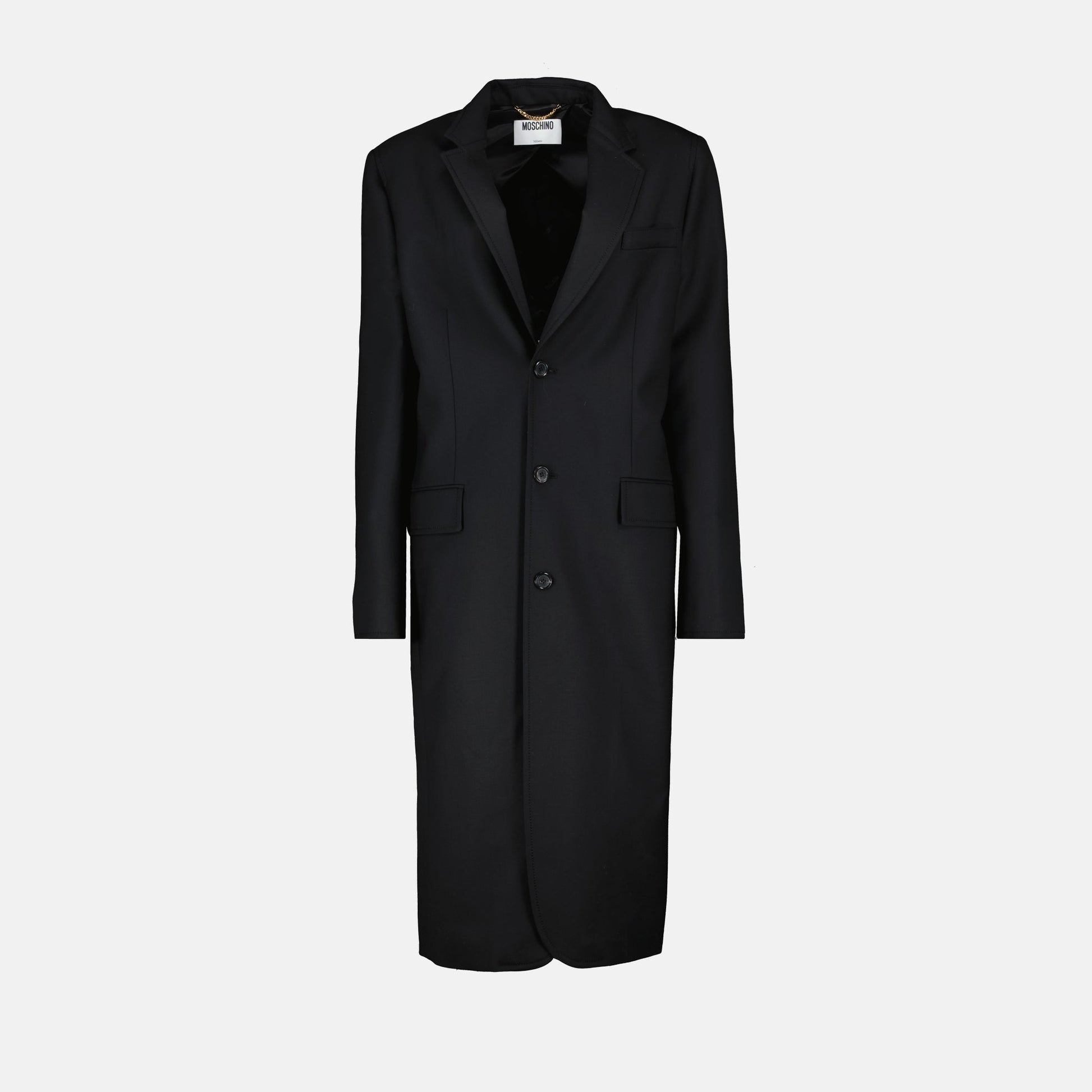 Black wool coat from Moschino for women, from the Autumn-Winter 2025 collection. It features a long cut, long sleeves, and satin details with a logo.