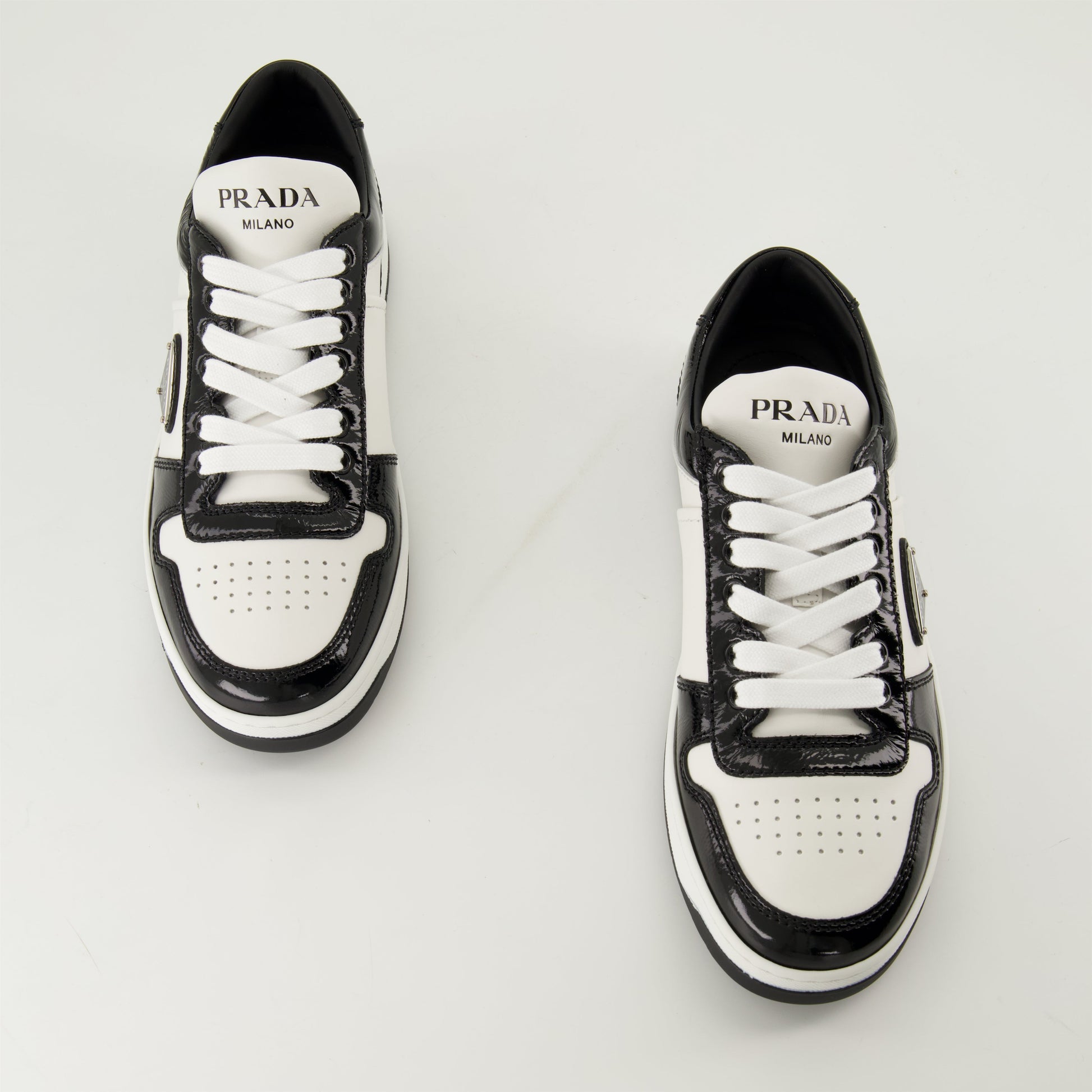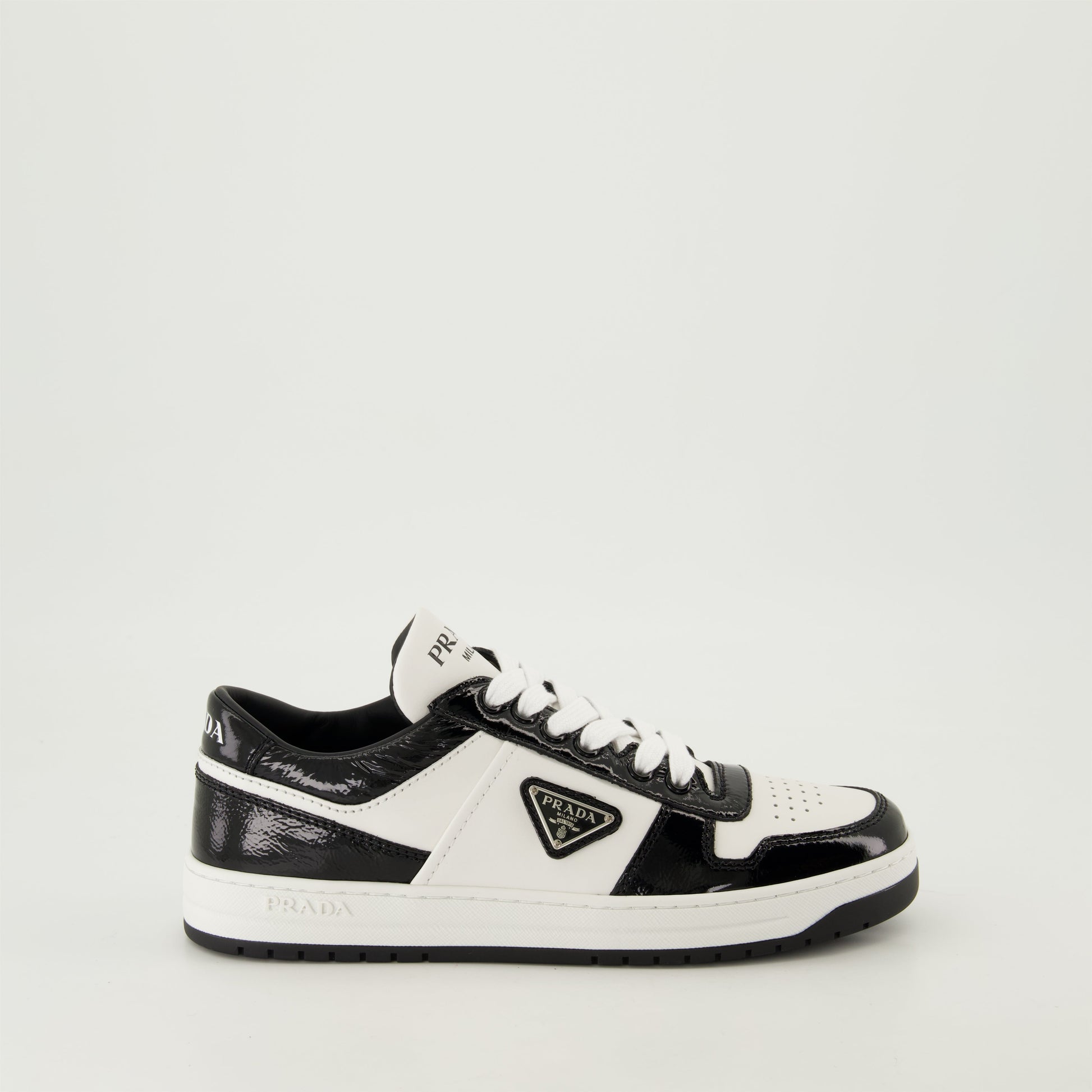 Black patent Downtown sneakers from Prada for women, Spring-Summer 2025 collection. This elegant model in calfskin features a two-tone design with a rubber lug sole and triangle logo.