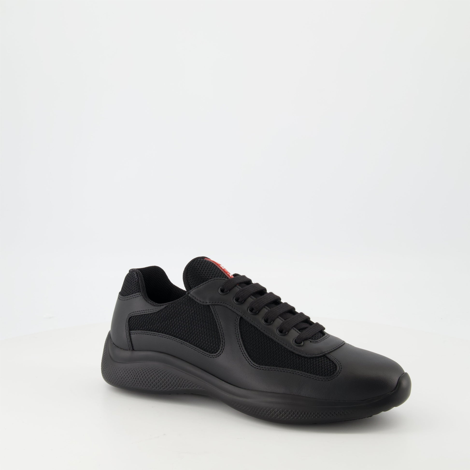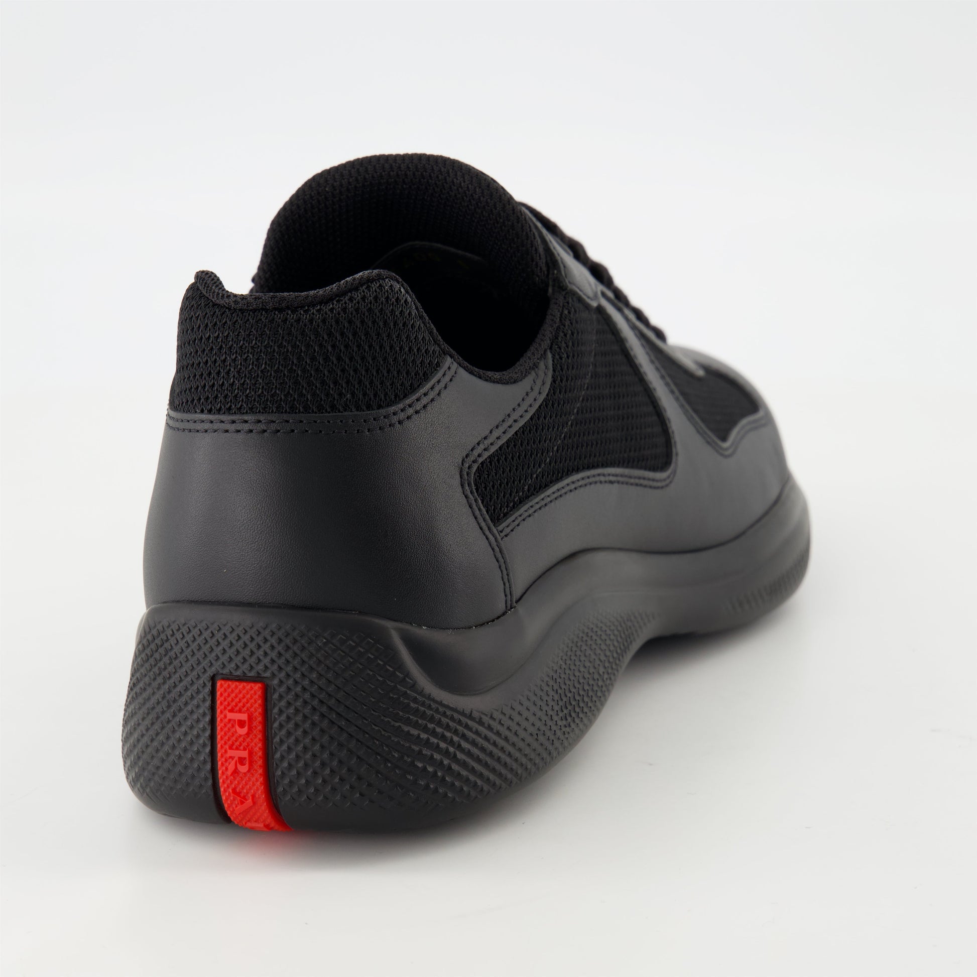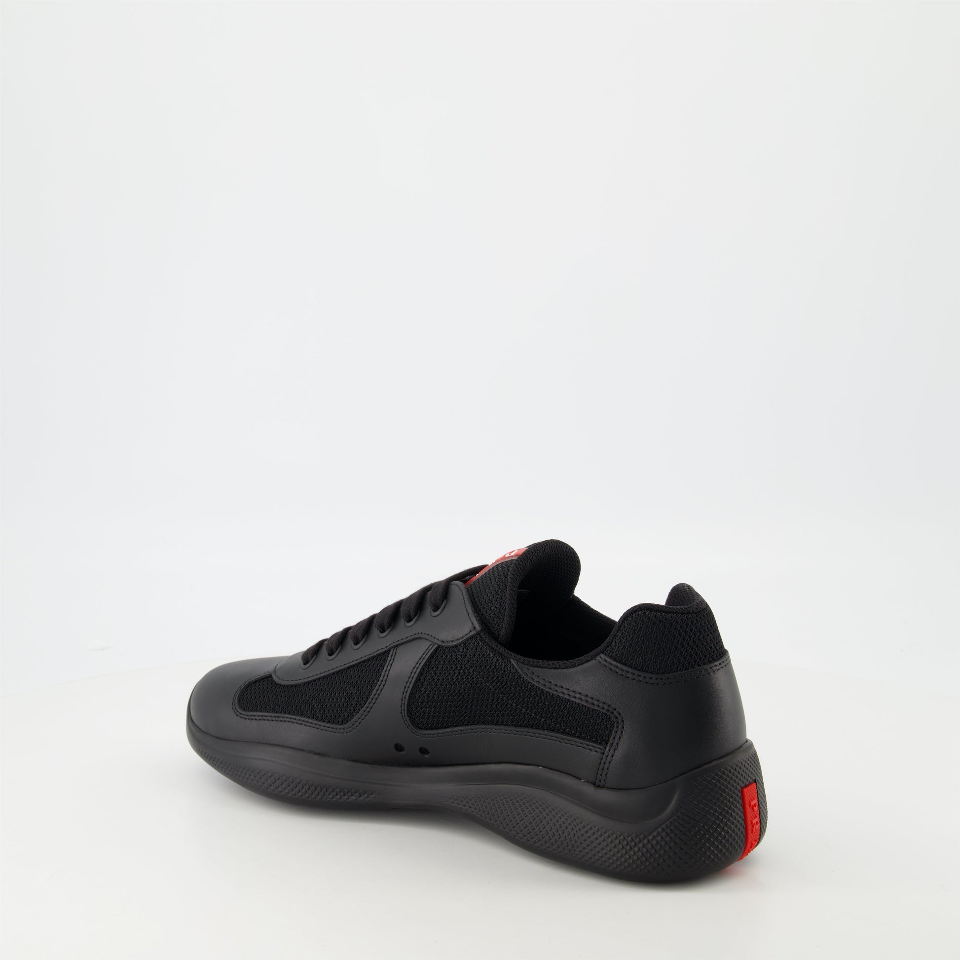 Black leather America's Cup sneakers by Prada for men combine elegance and comfort. This pair is part of the Spring-Summer 2025 collection, featuring refined and modern details.