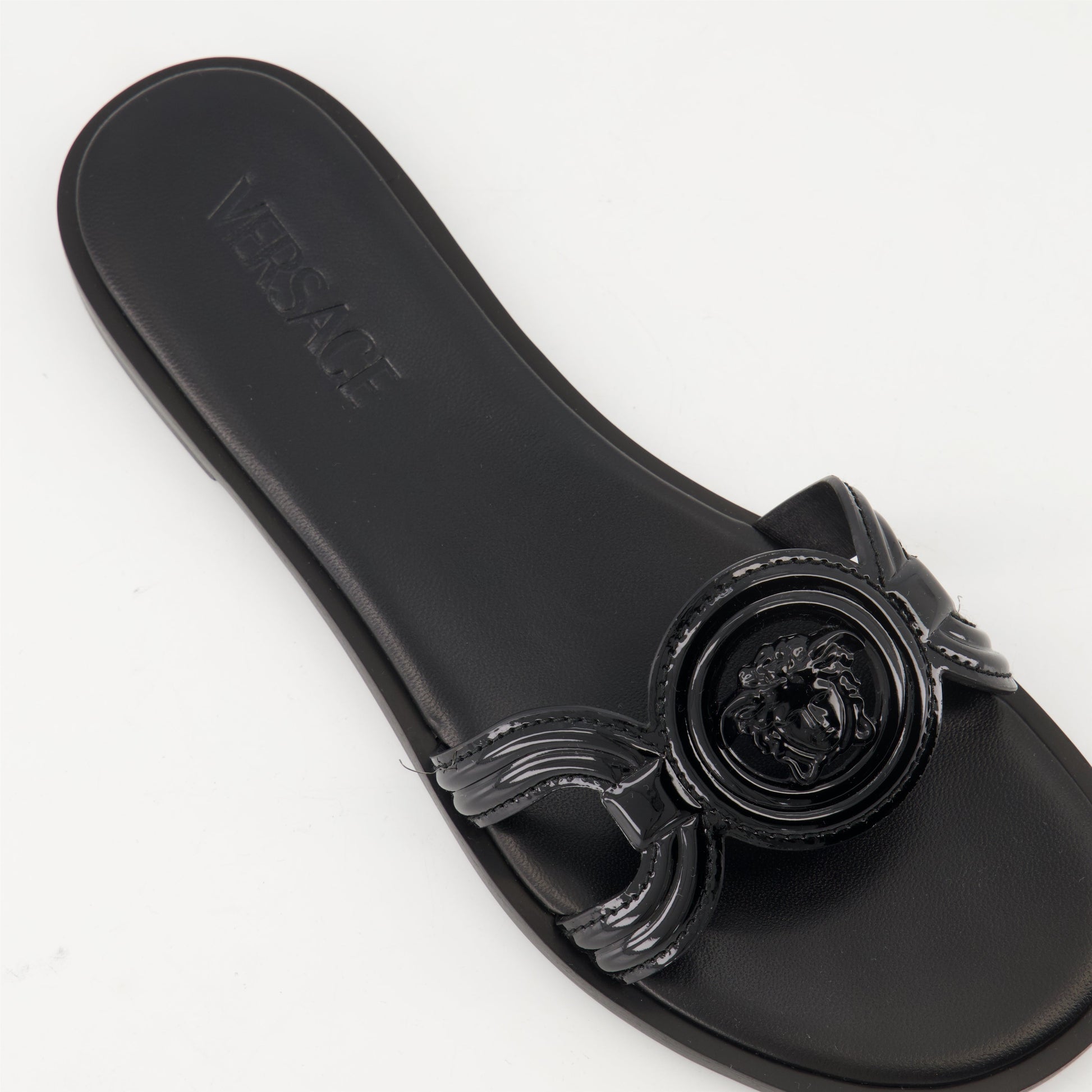 Black leather Medusa '95 slippers from Versace for women from the Spring-Summer 2025 collection. They feature a slip-on design with an iconic pattern and a leather sole.