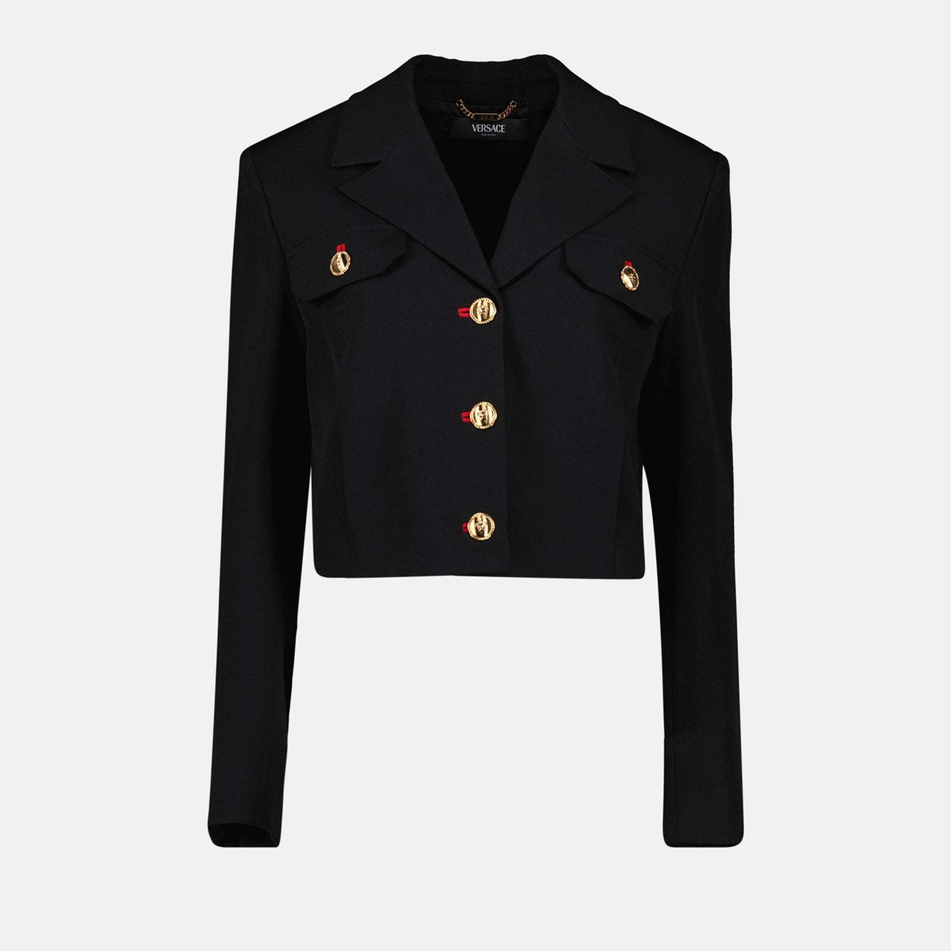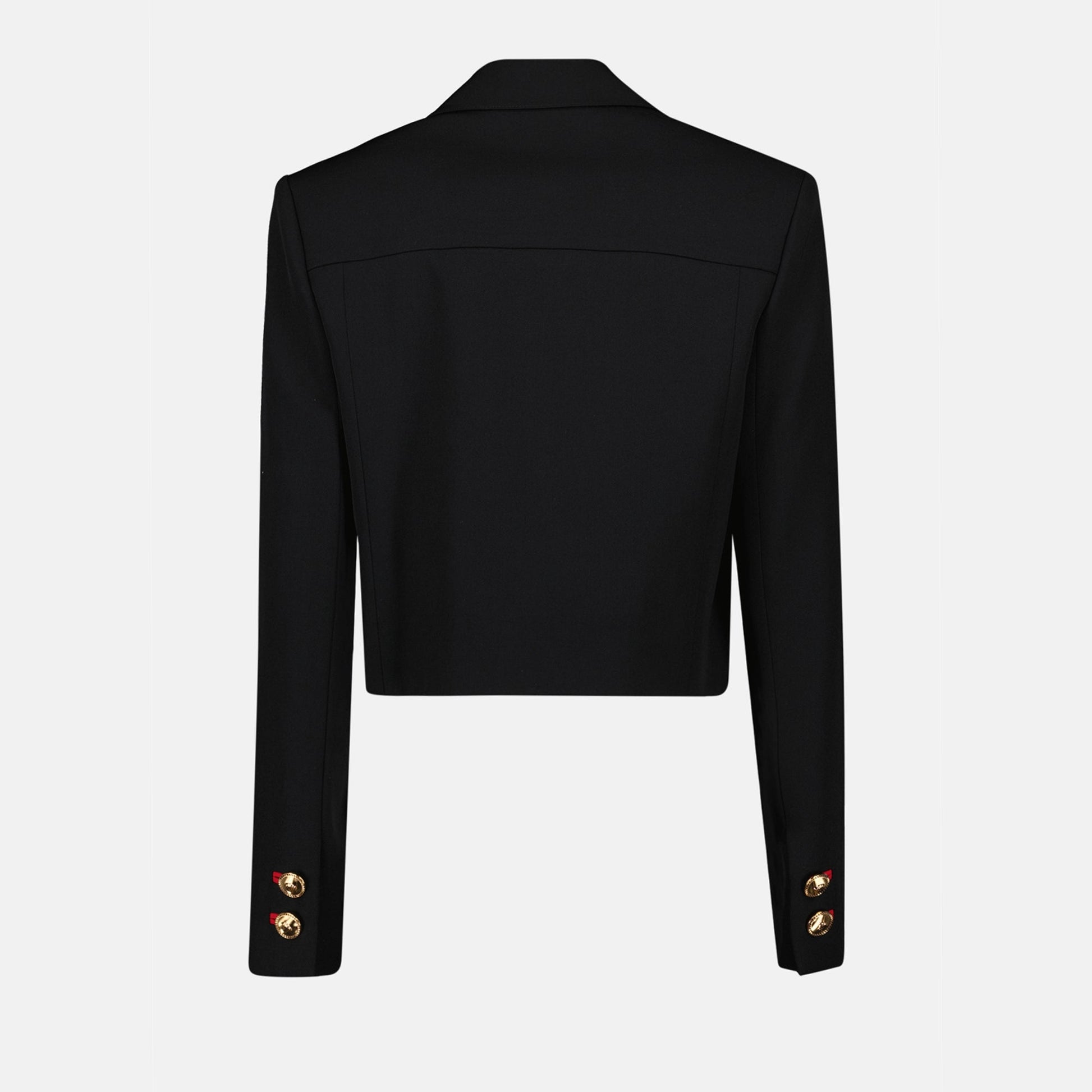 Short wool jacket from the Versace Fall-Winter 2024 collection for Women. Made from wool. Black color. Pointed lapel collar and long sleeves.