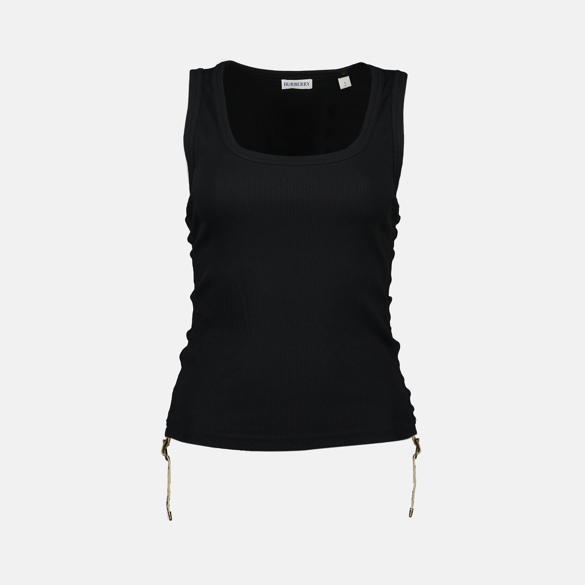 Black cotton tank top from Burberry for women, from the Spring-Summer 2025 collection. It features a slim fit with Check pattern details and adjustable straps.