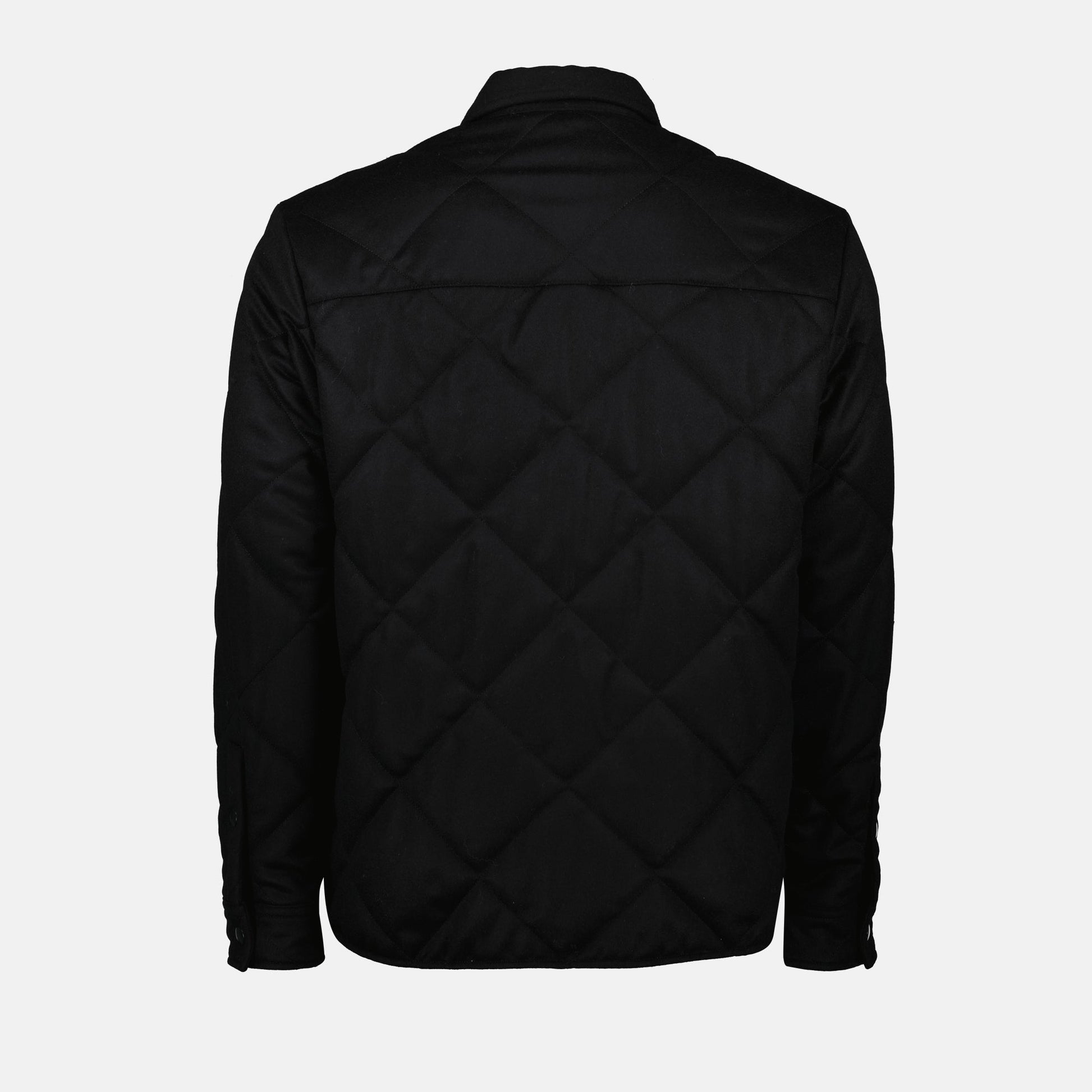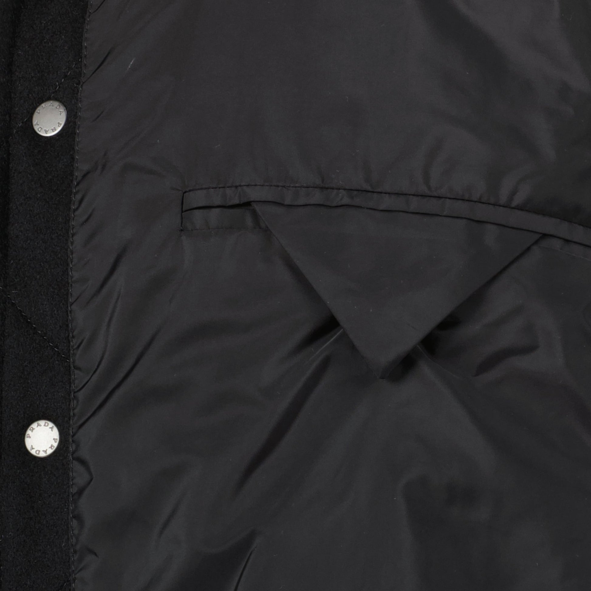Quilted wool jacket from Prada for men, from the Autumn-Winter 2025 collection. It features a classic collar, long sleeves, and an enameled metal triangle logo.