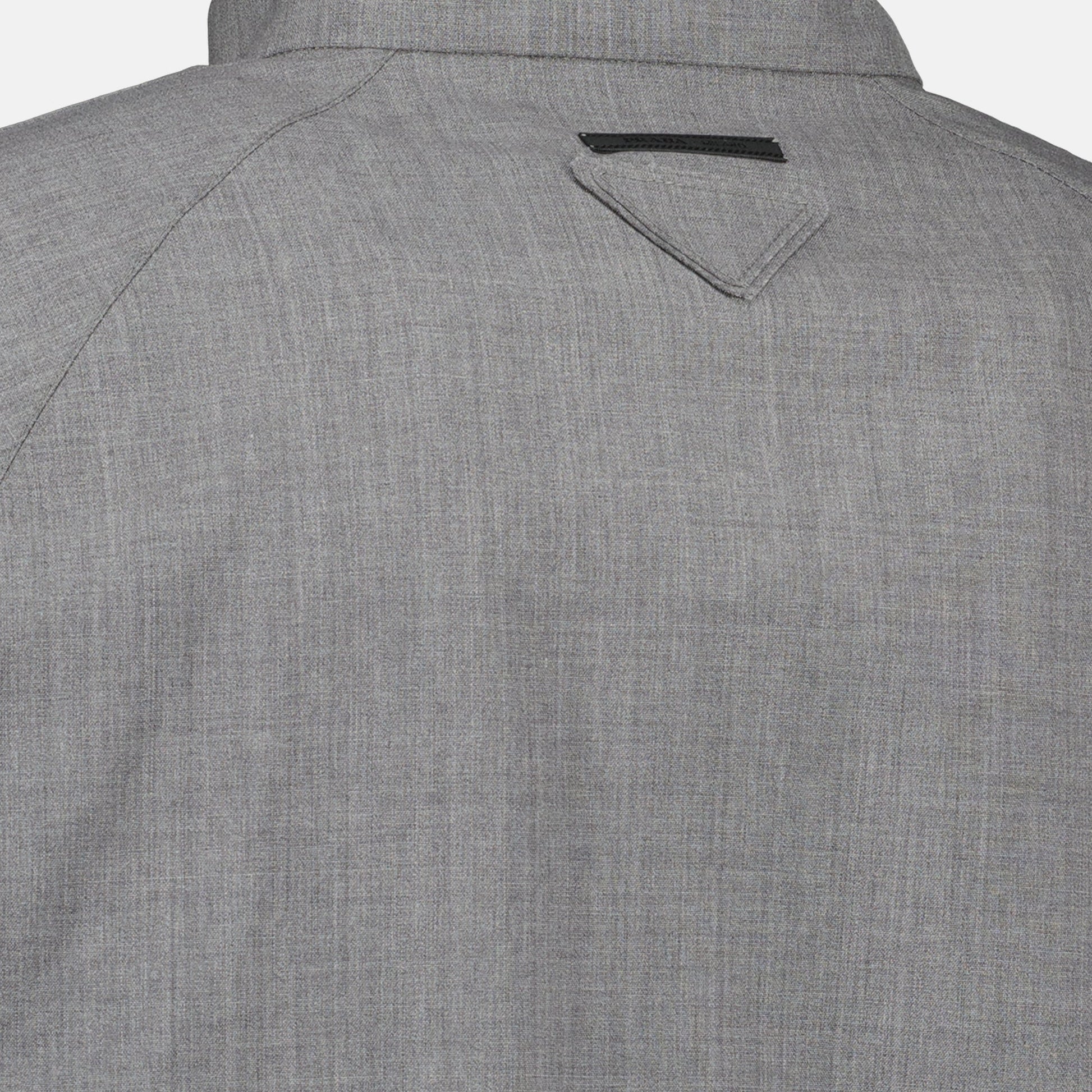 Gray wool jacket by Prada for men, from the Autumn-Winter 2025 collection. It features a high collar, long sleeves, and a zippered front closure.